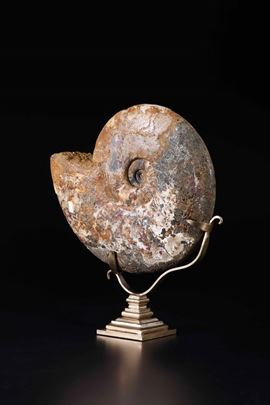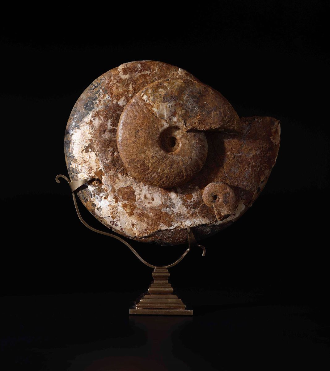 Blocco composto da tre ammoniti finemente liberate dalla matrice rocciosa e composte su una base in metallo. Madagascar, cm 36x31x9