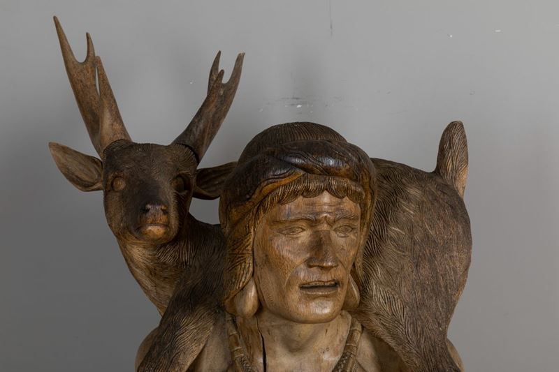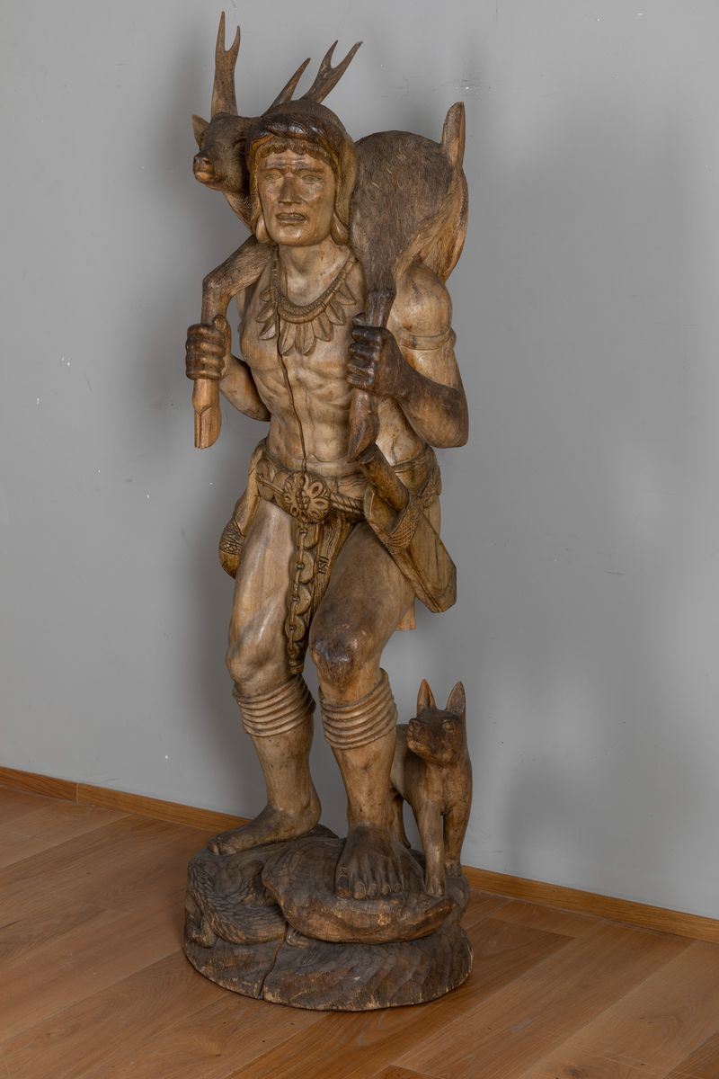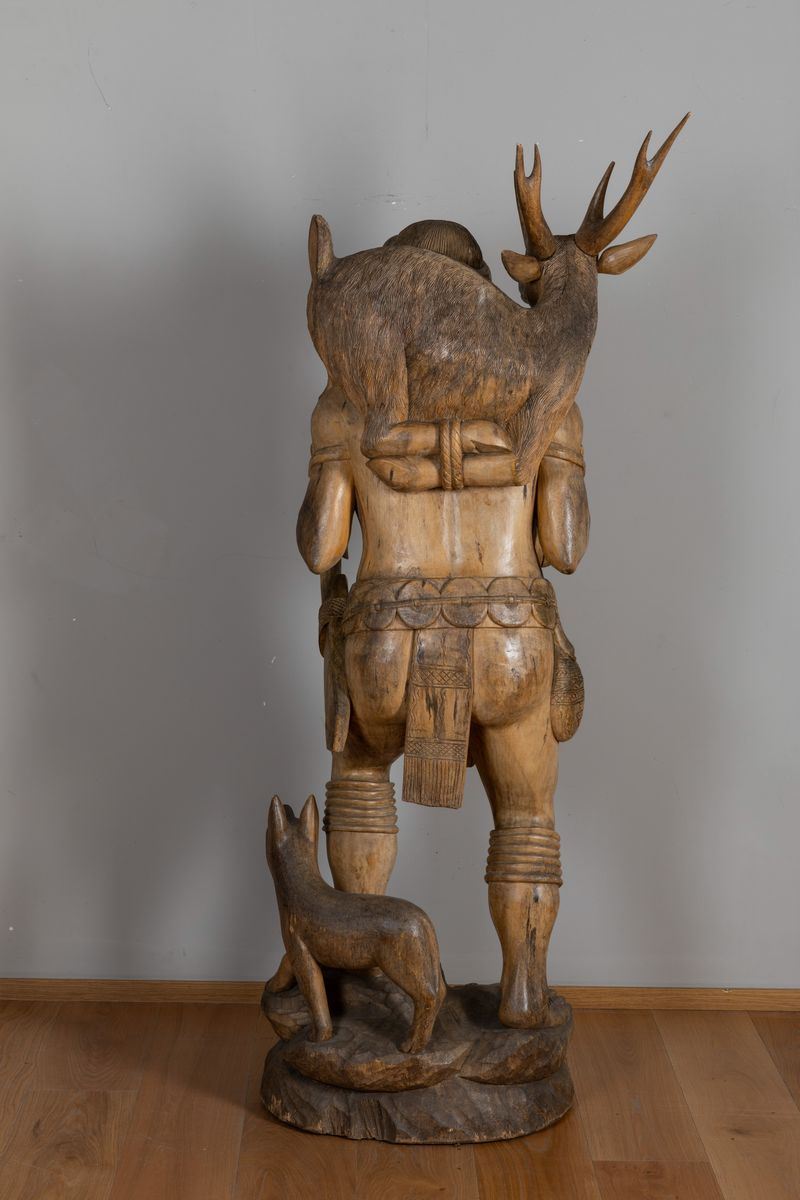 La rappresentazione di uno degli aspetti primari della vita dei nativi Ifugao, nelle Filippine, oltre a quella della coltivazione del riso con le sue divinità protettrici, è quella del cacciatore di cervi, accompagnato dal suo fidato cane. Spesso è possibile trovare statue in legno con le fattezze del cacciatore col cervo sulle spalle all’ingresso delle abitazioni. Ma come questo reperto della prima metà del 1900 sia giunto fino a noi, passando per un castello Bavarese, rimane un mistero, denso di domande: è stato portato da un commerciante che intesseva relazioni con le Filippine? O da un esploratore ammaliato dalla bellezza anatomica idealizzata del cacciatore? O forse ancora come ricordo della terra natia? Molte domande avvolgono questo gruppo scultoreo, che lo rendono ancor più affascinante e aumentano la bellezza enigmatica e magnetica, che solo certi oggetti del passato sono in grado di trasmettere.