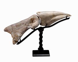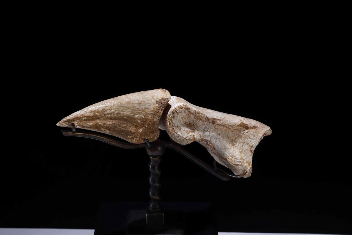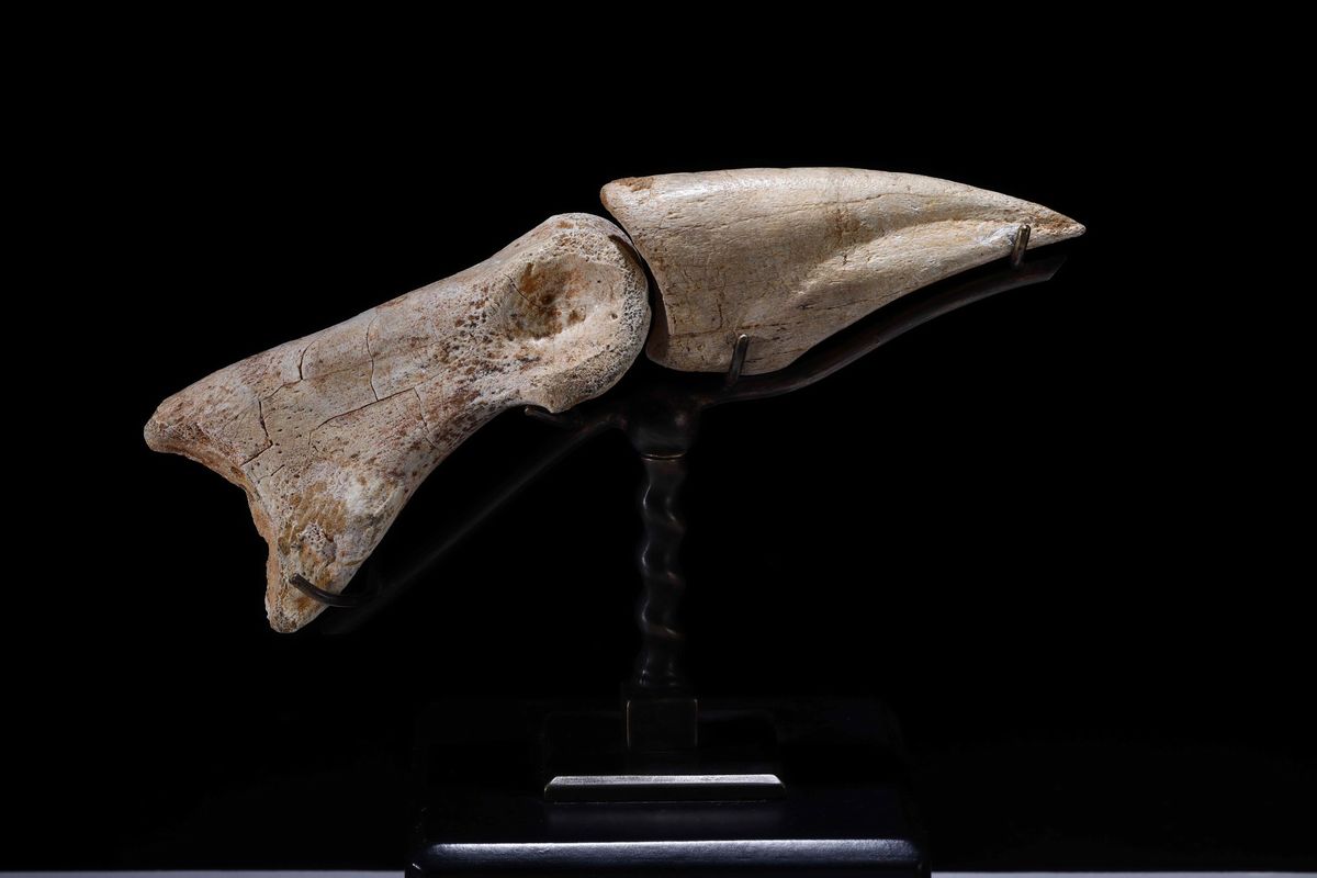 completo di falange, condizioni eccezionali. Il Carcharodontosaurus era uno dei più lunghi e pesanti dinosauri carnivori noti alla scienza. Kem Kem, Marocco. Albiano-Turoniano, Cretacico. Base in ottone e legno, cm 20x4