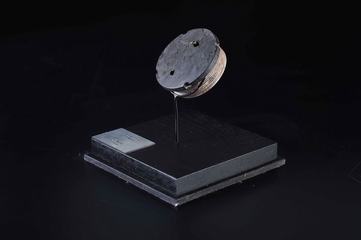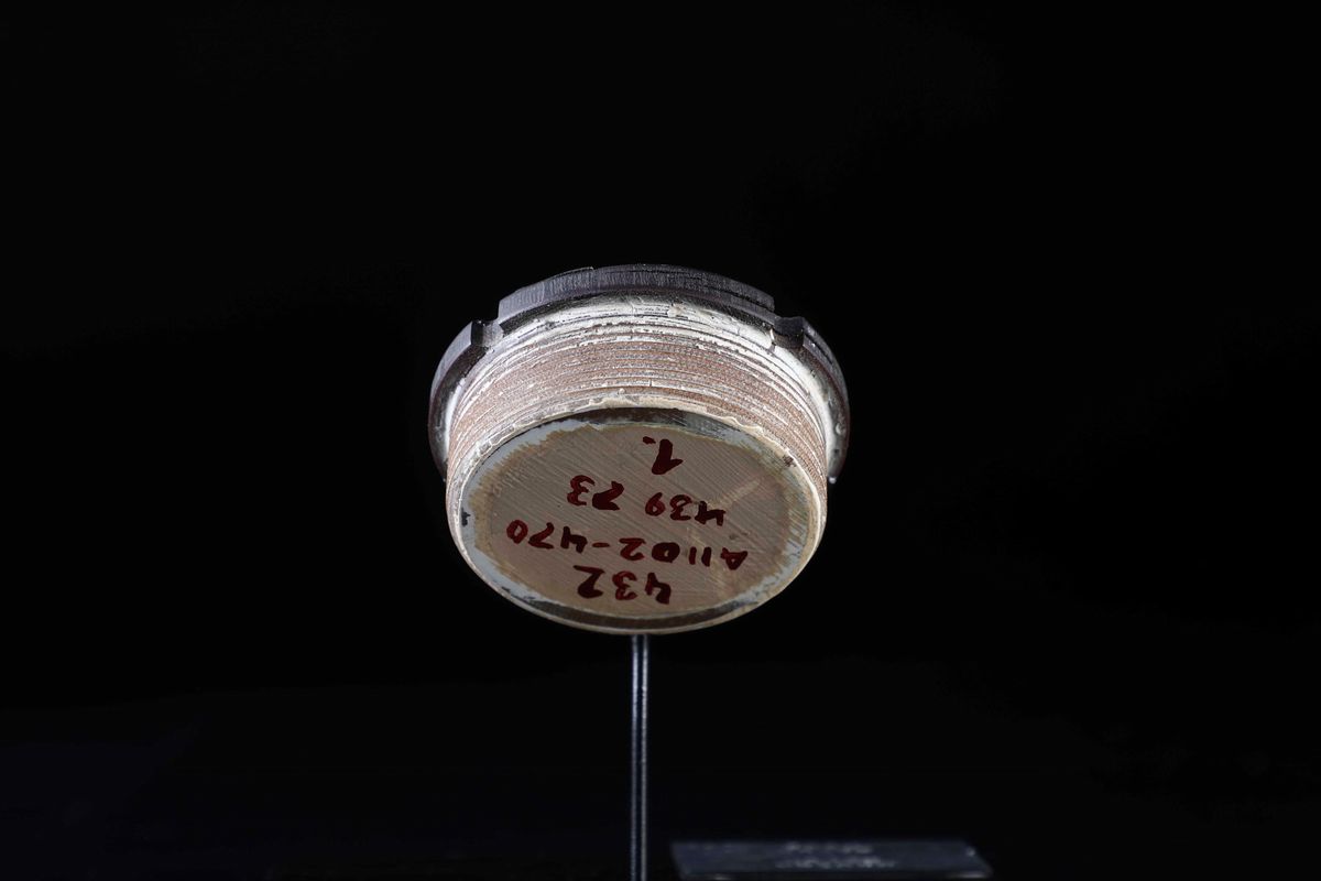 Segni d'usura dovuti al rientro della capsula nell'atmosfera. Su base in legno e metallo. Collezione privata francese, cm 8x3