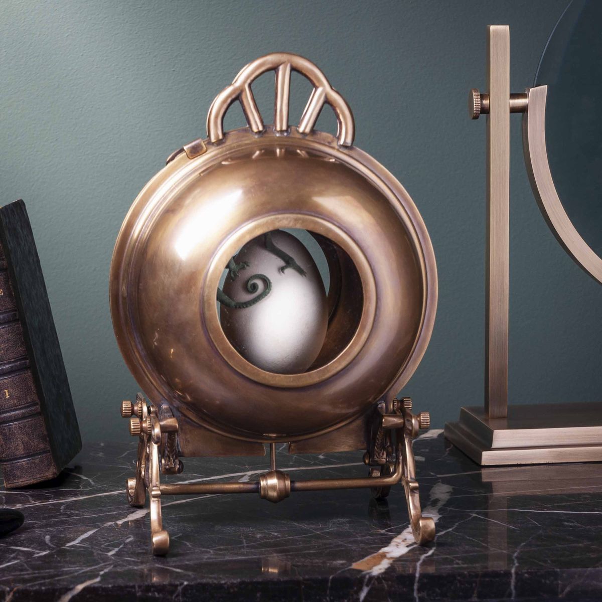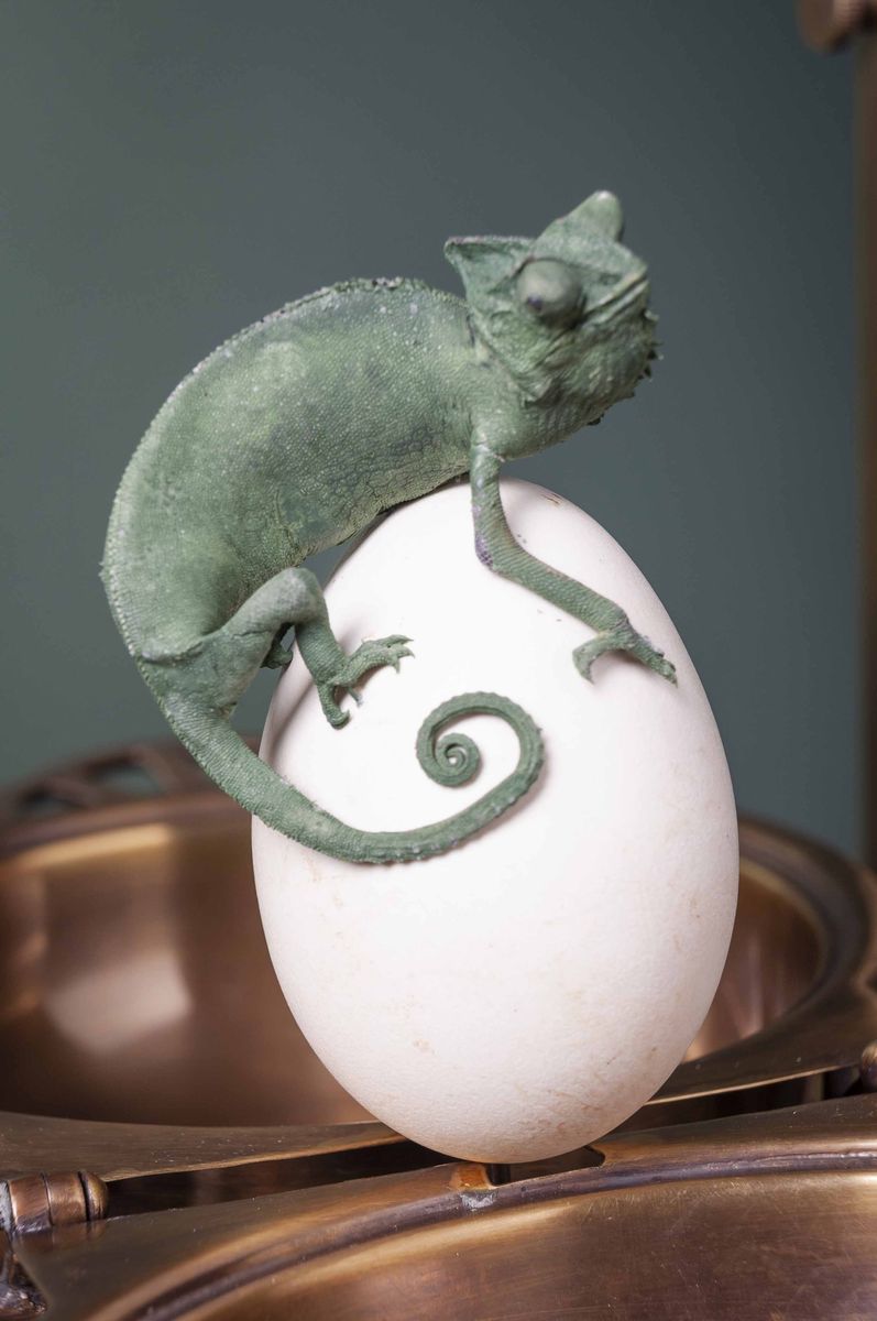 Camaleonte velato (Chamaeleo calyptratus) su uovo di oca, montato in uno scrigno apribile in ottone e vetro