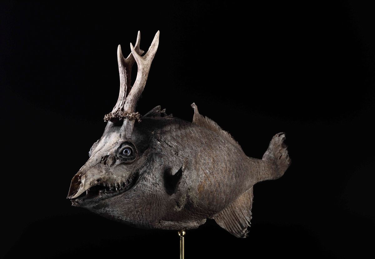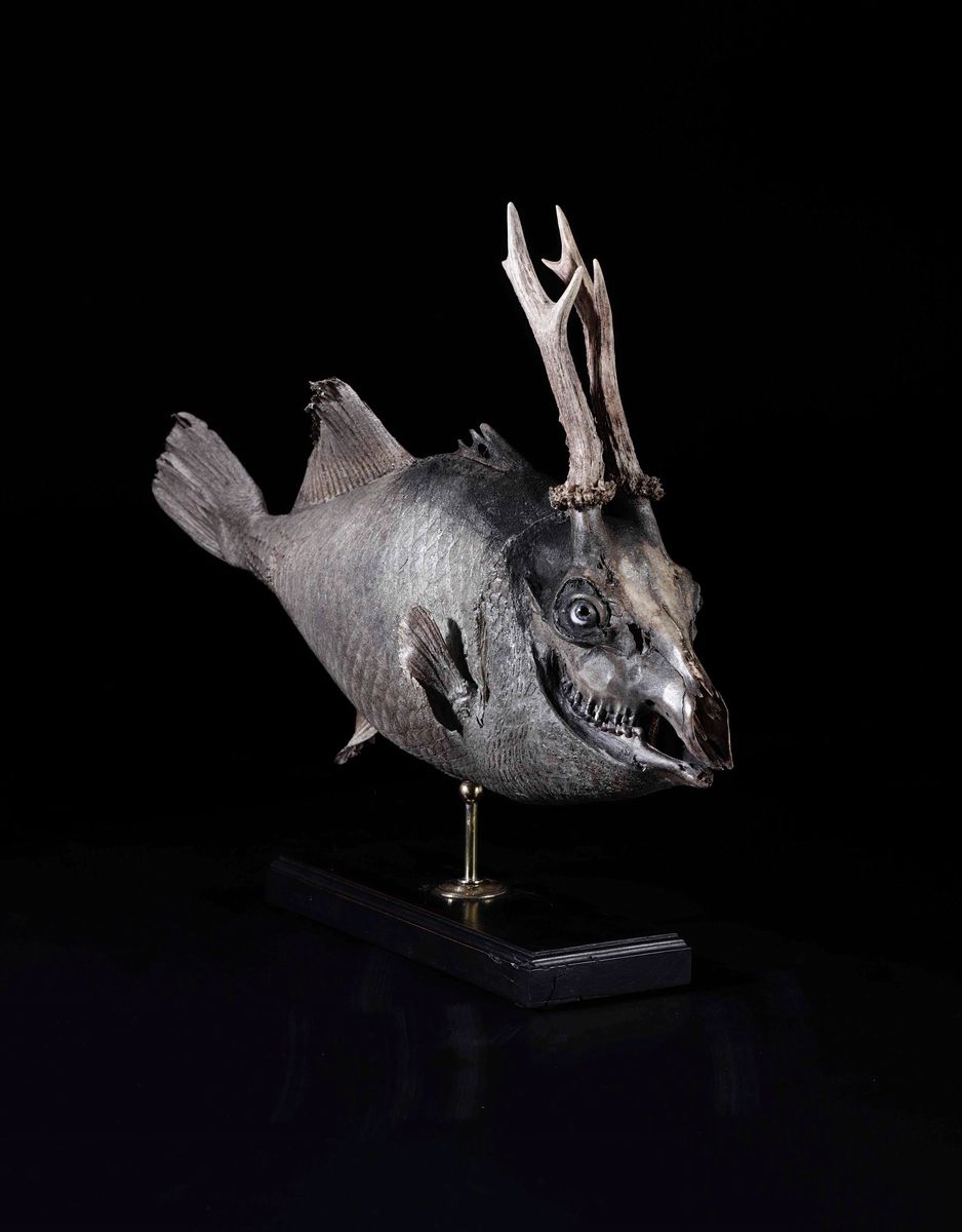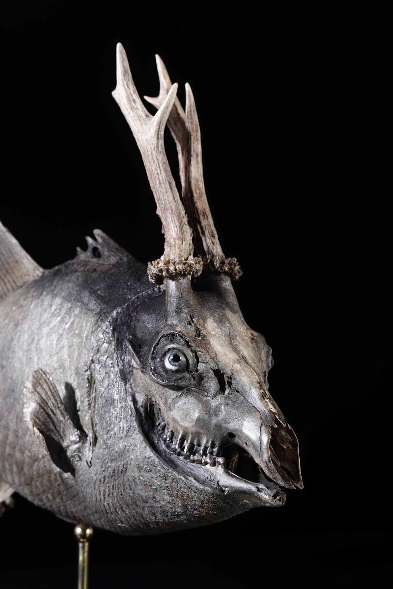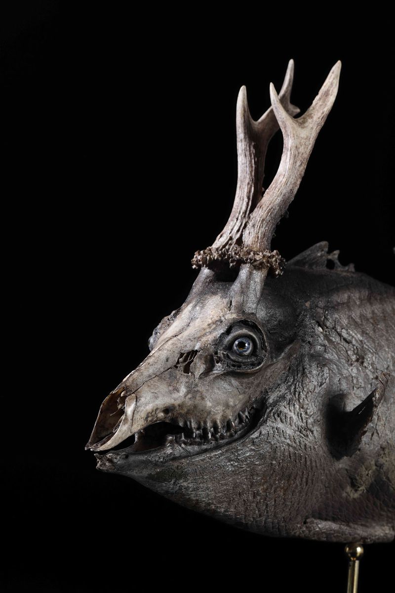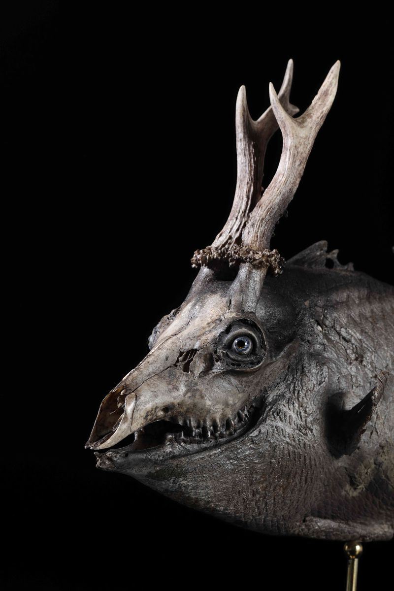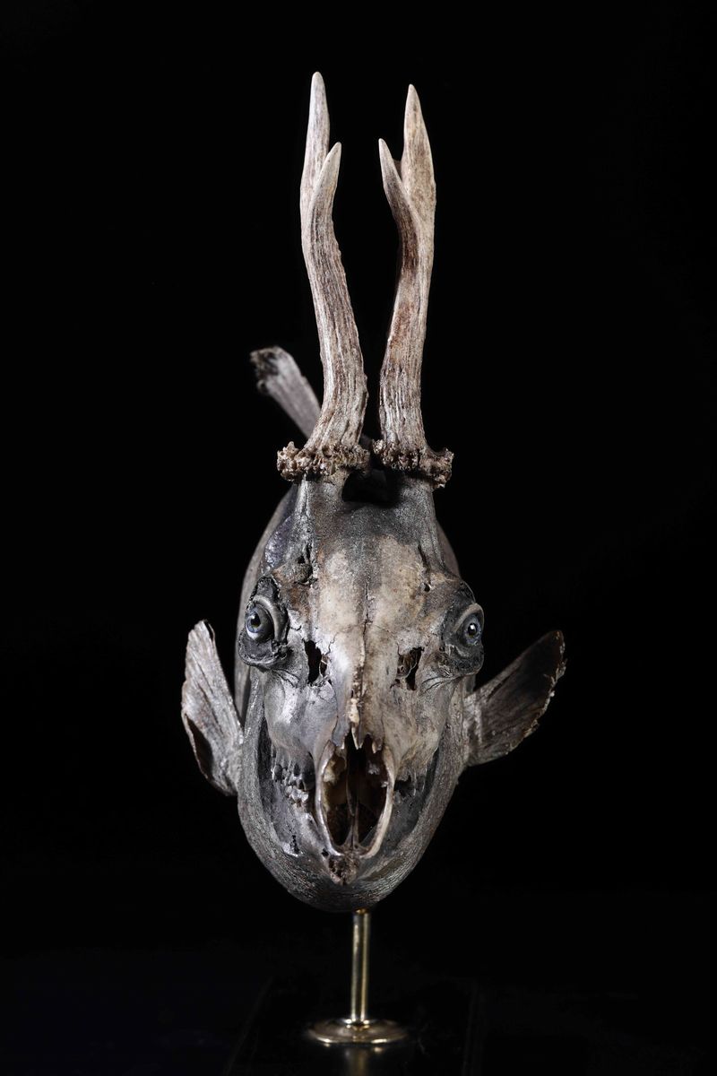 Tassidermia di pesce balestra, cranio di capriolo, cm 16x60x32