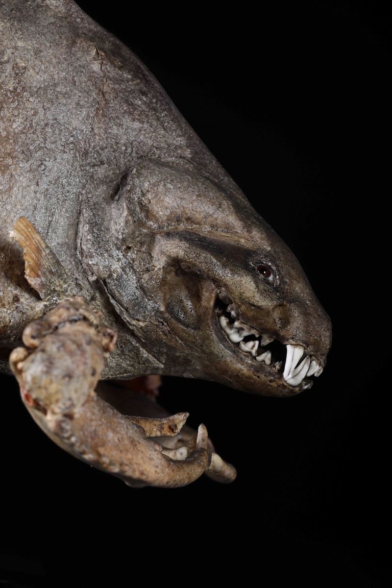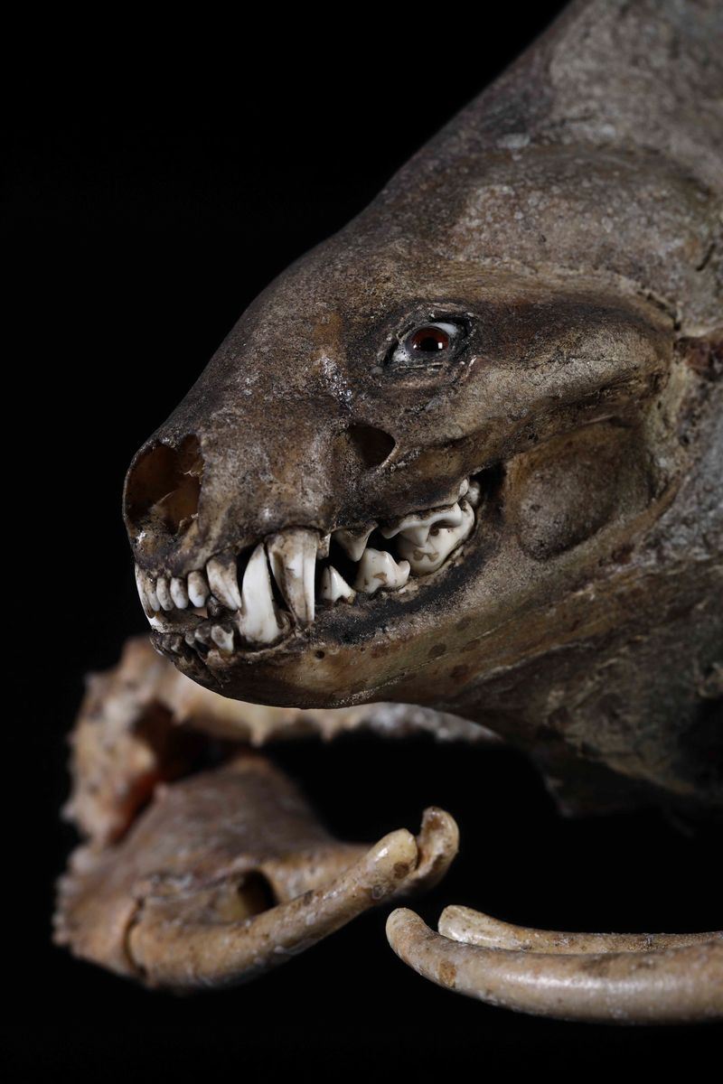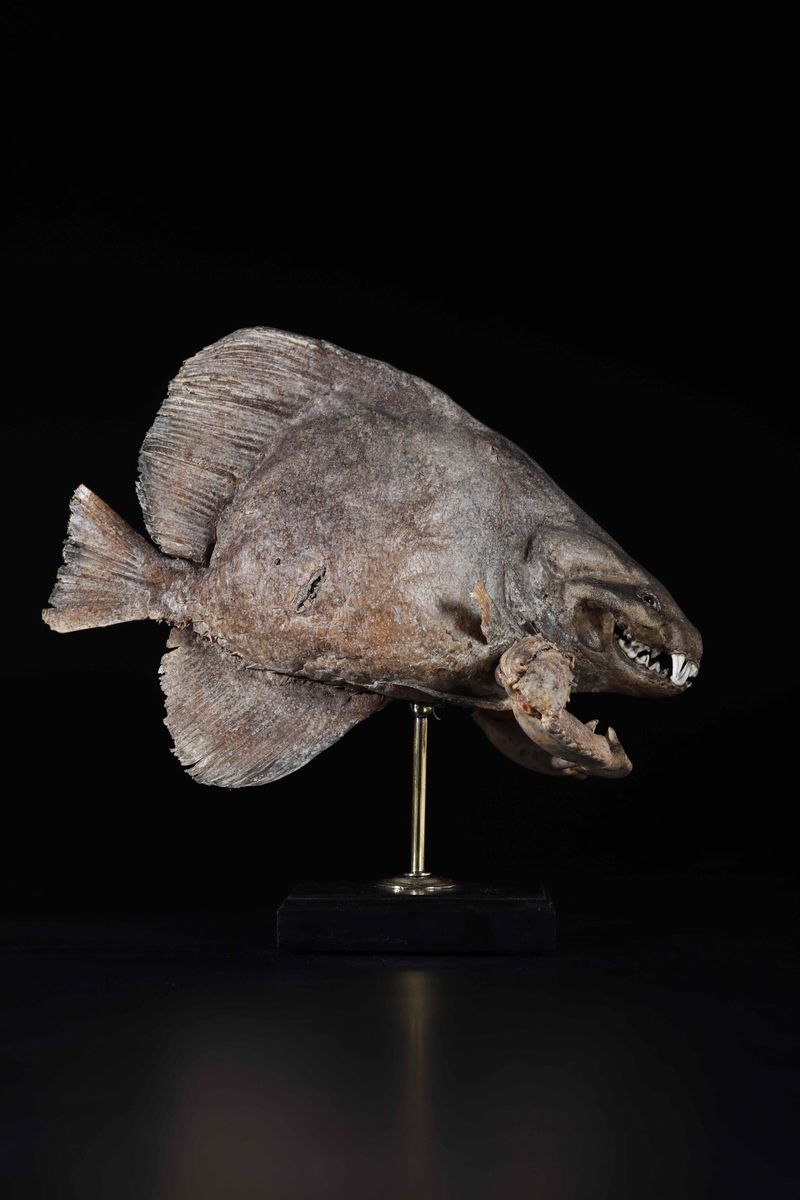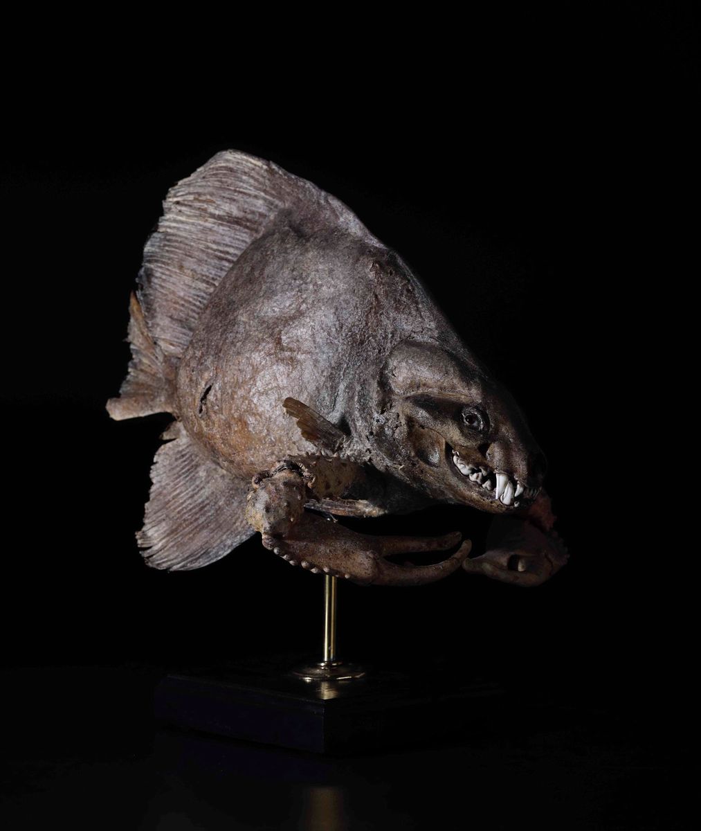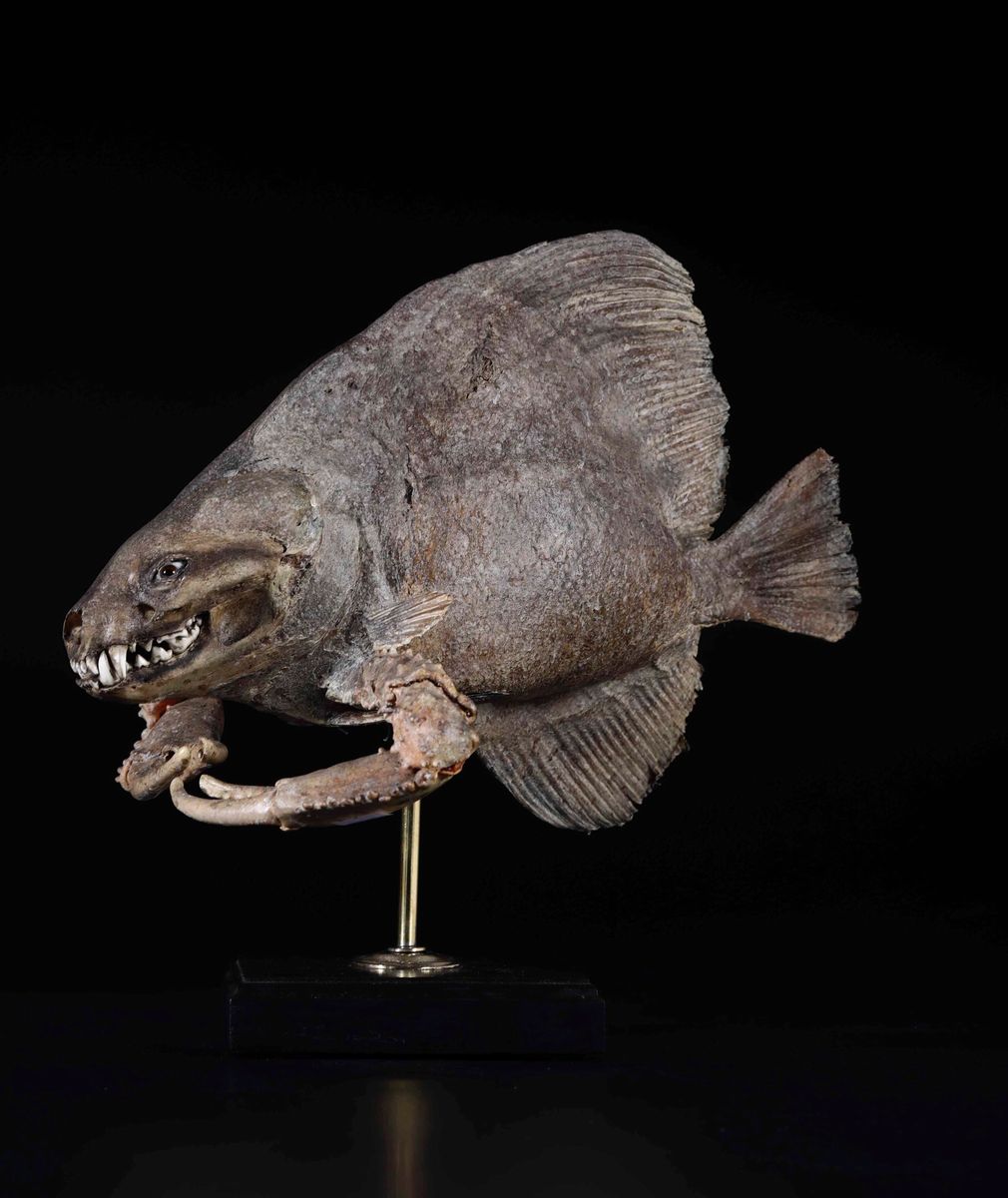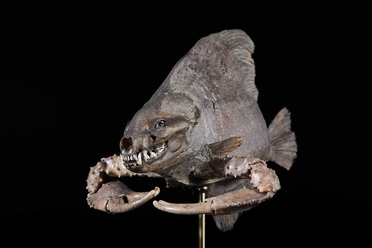 Elementi di pesce tassidermizzato, cranio di tasso, chele di granchio, cm 37x25x27