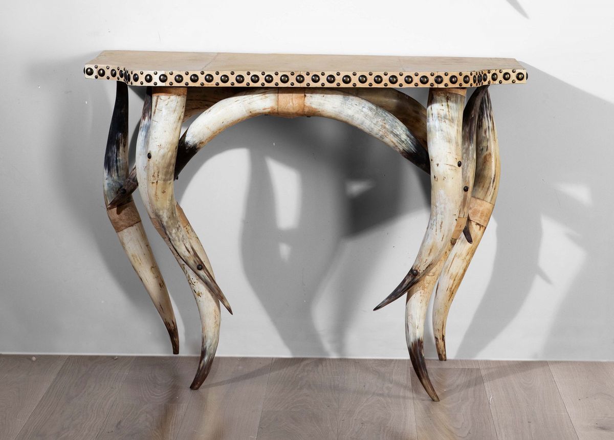Consolle in corna di bue rivestita in pergamena con borchie, seconda metà XX secolo