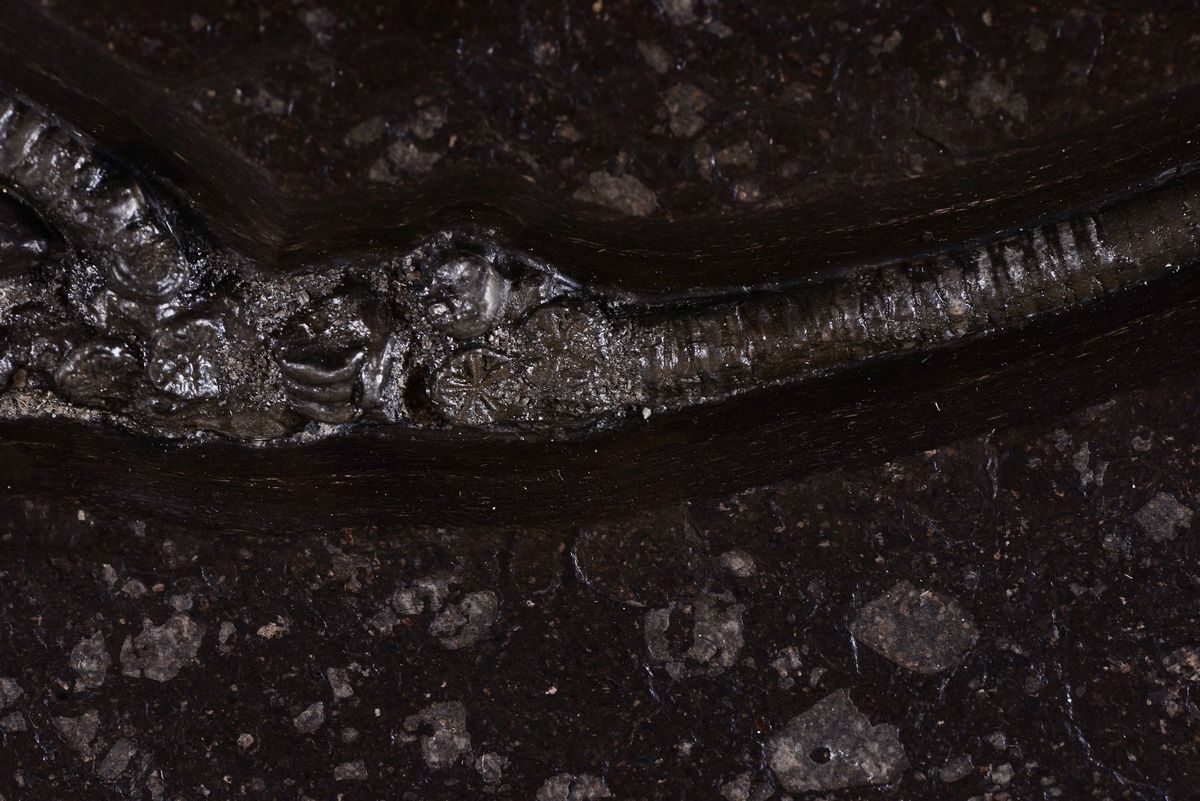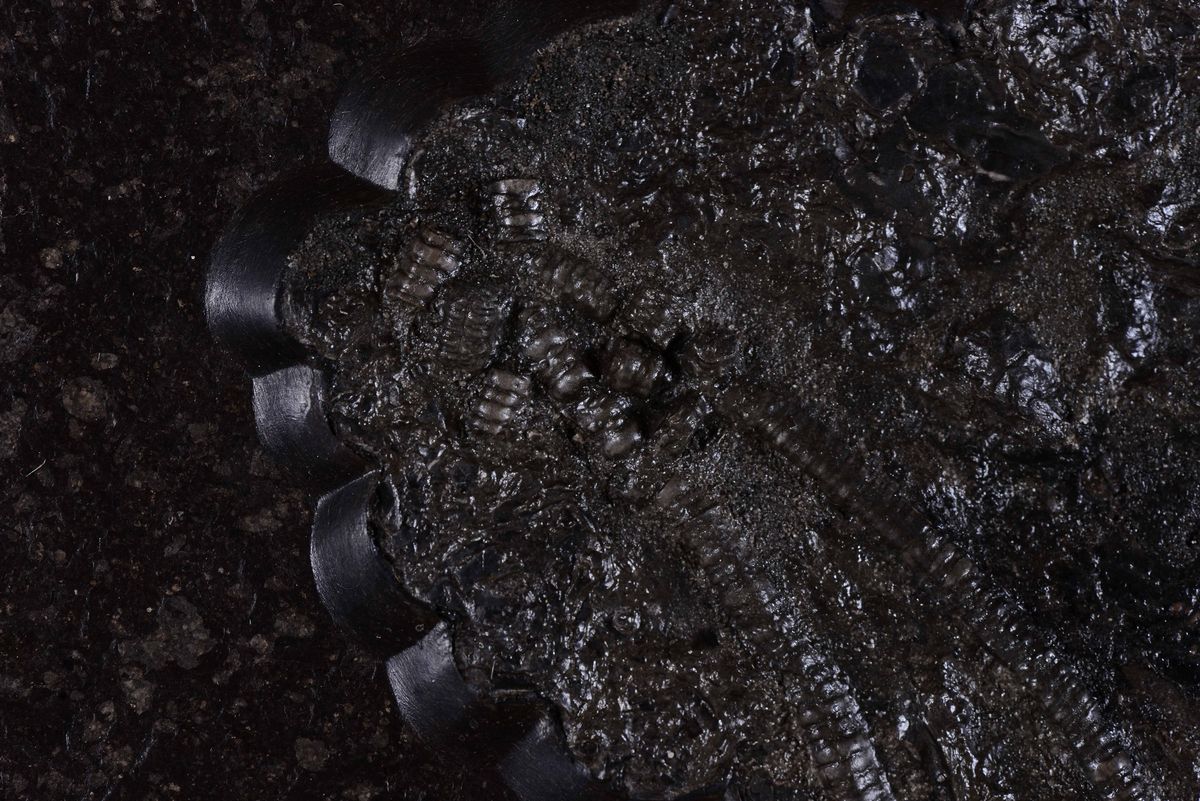 Seirocrinus subangularis Pliensbachiano-Toarcian0, Giurassico Inferiore (182.7– 199.3 ma) – Formazione Posidonia Shale, Holzmaden Germania. Collezione privata tedesca. In cornice di metallo, struttura posteriore atta al montaggio a muro. cm 150x80