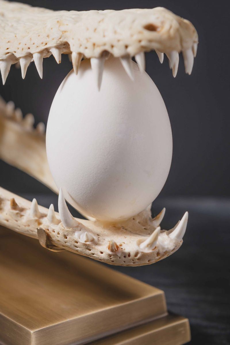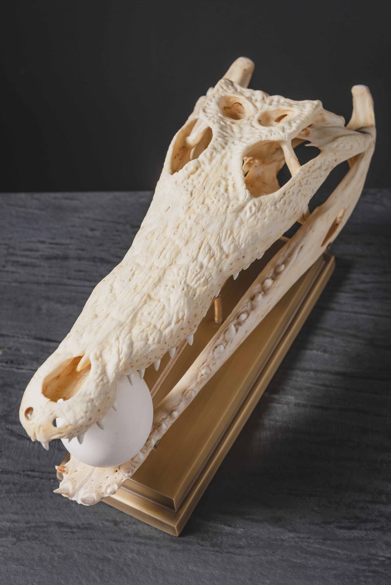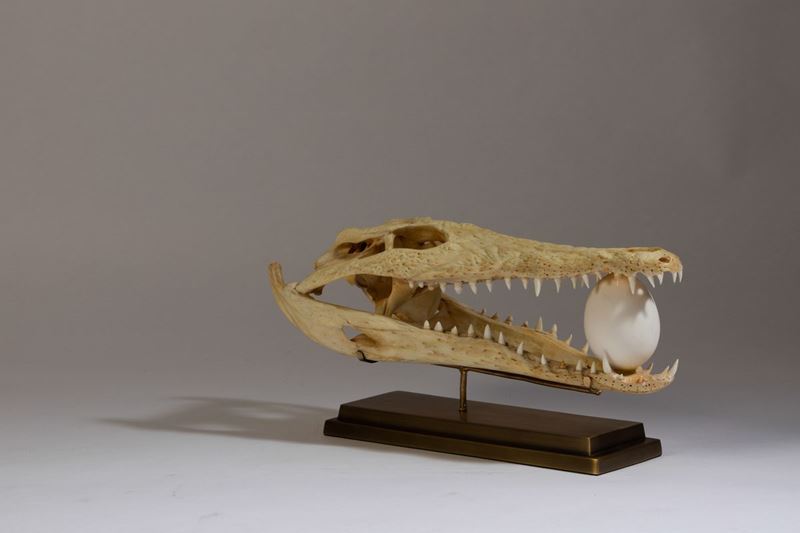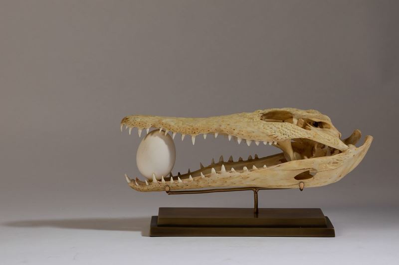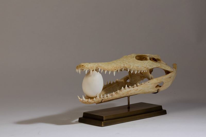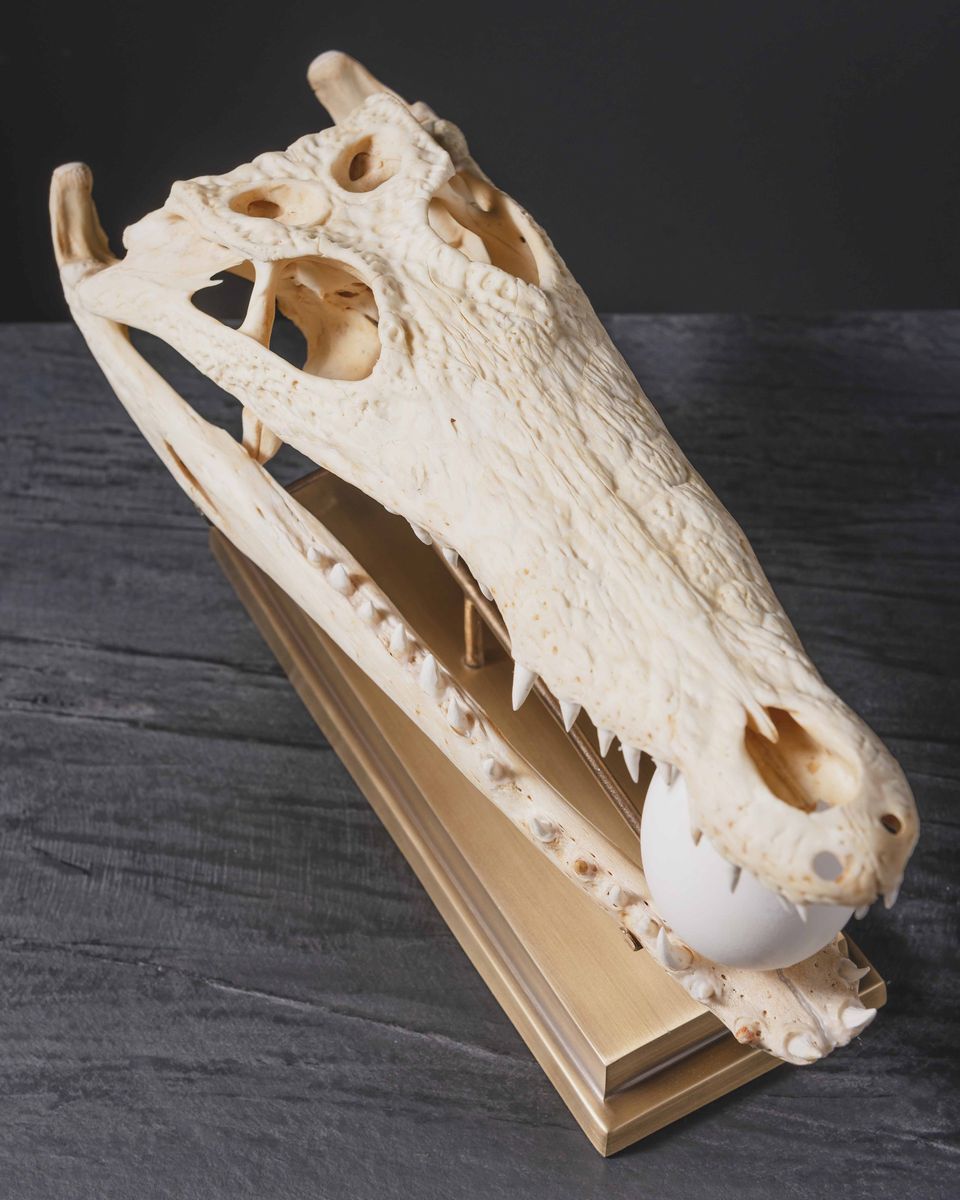 Cranio di coccodrillo e uovo di oca su base in ottone