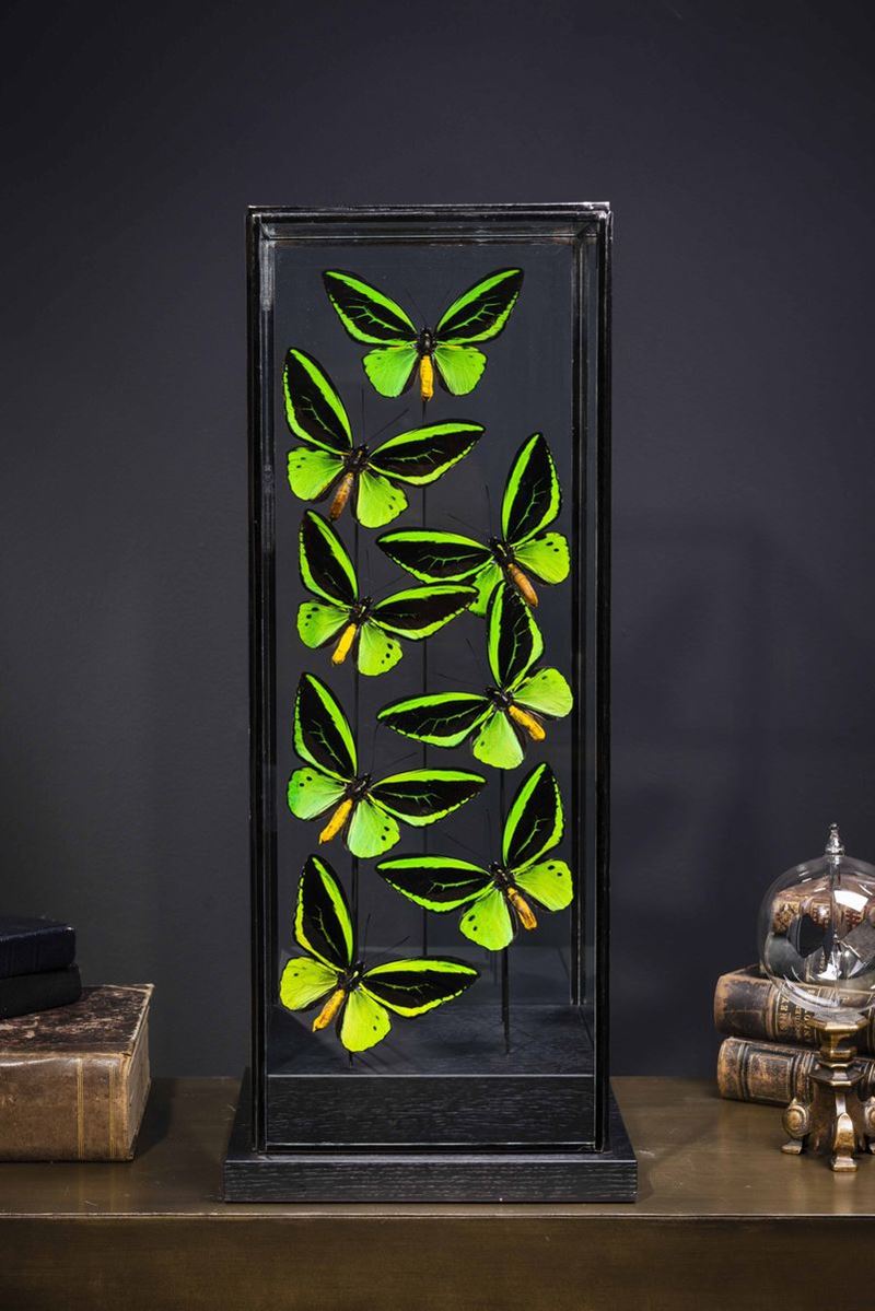 Otto esemplari di Ornithoptera priamus in una vetrina in vetro e base in legno. cm 60,5x25x25 CITES II/B