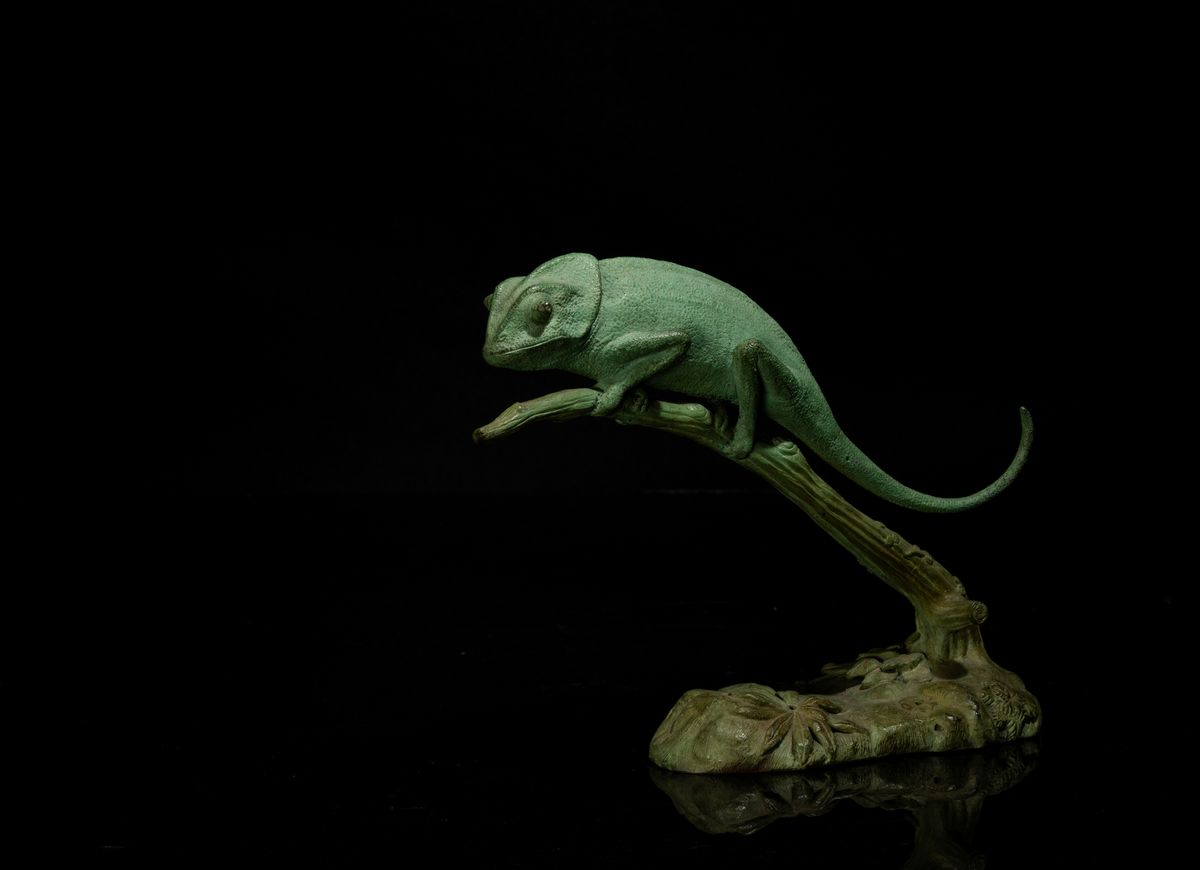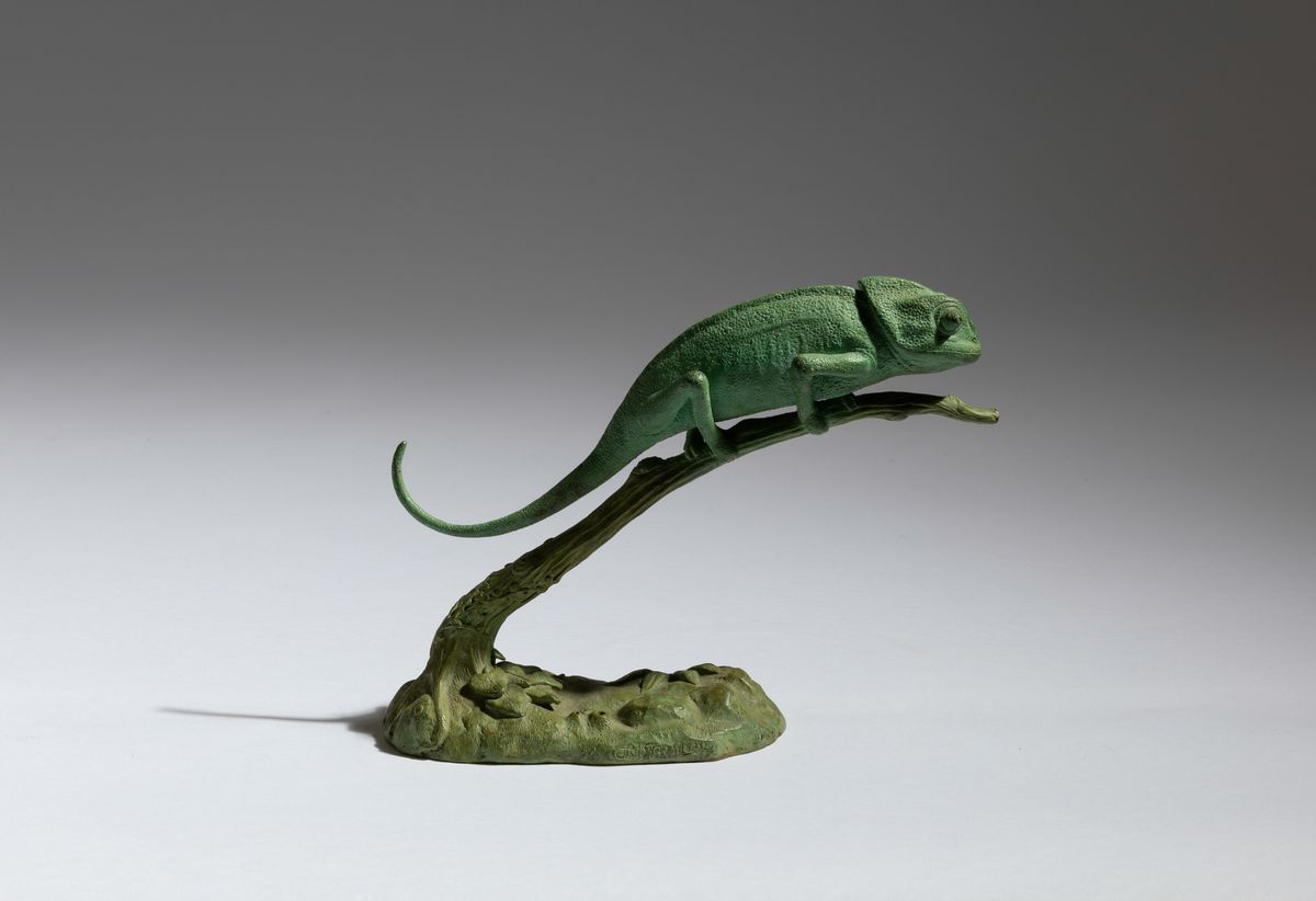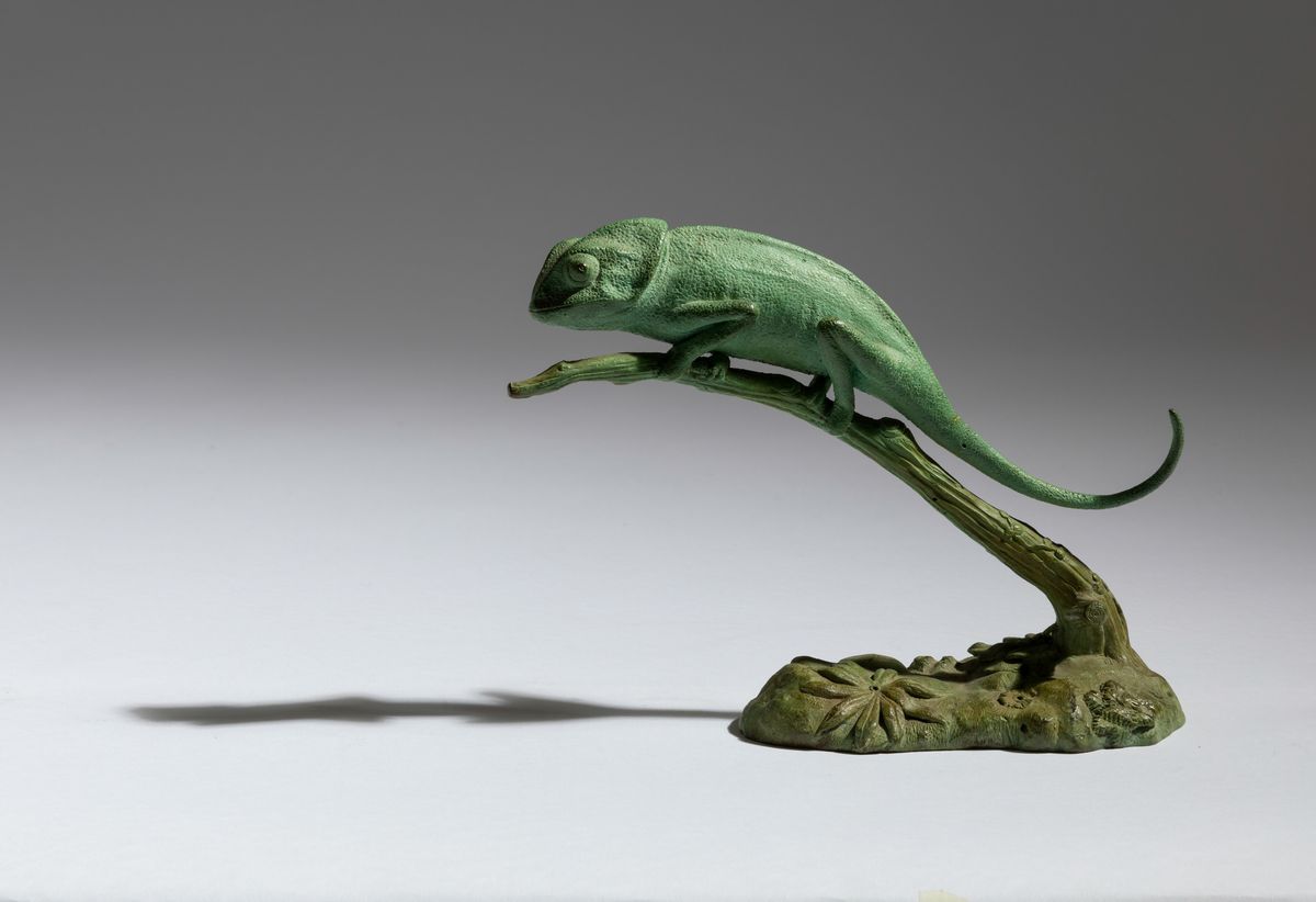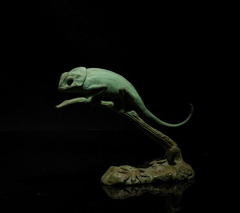 Figura di camaleonte in ferro proteso su ramo, XX secolo