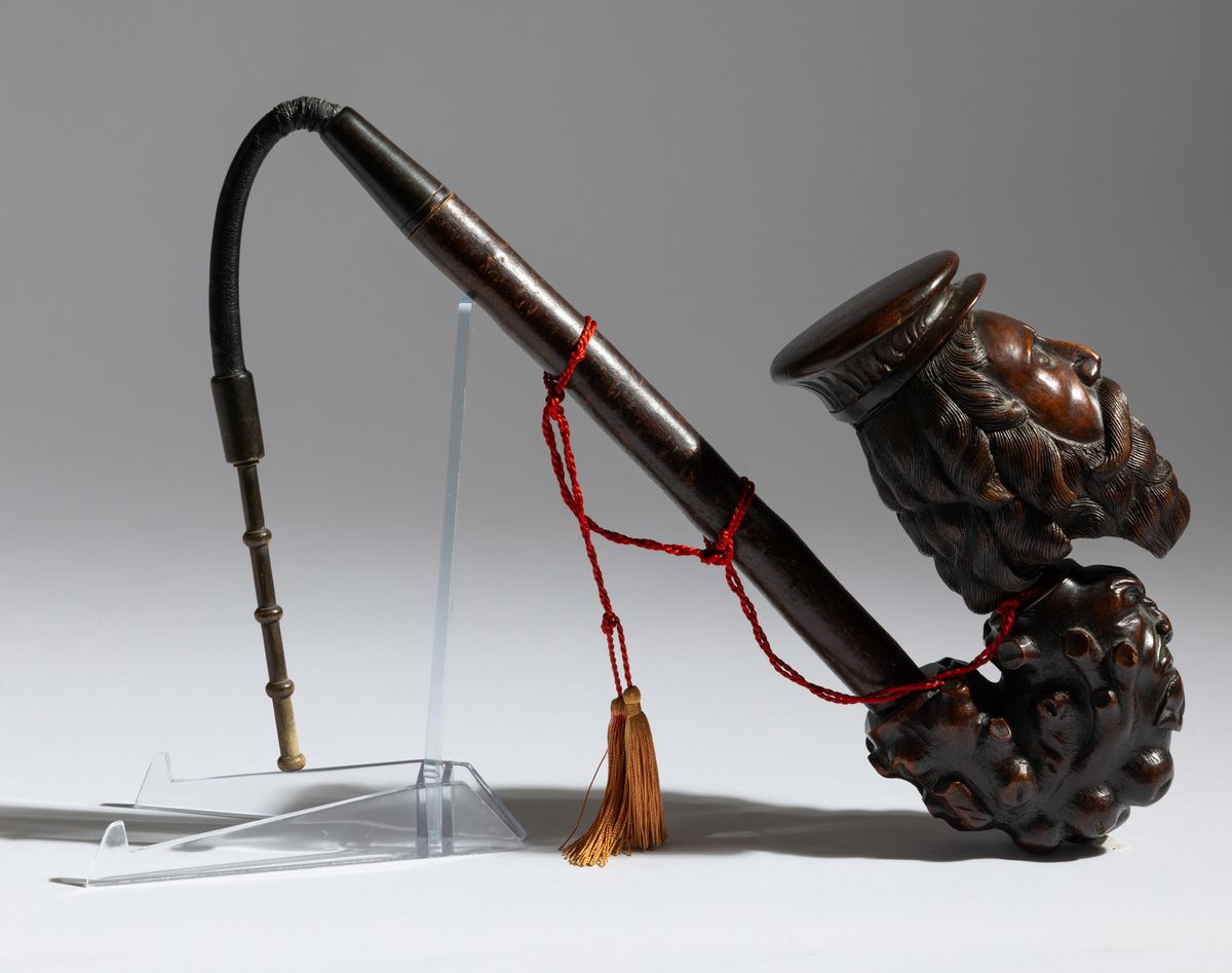 Grande pipa in radica raffigurante marinaio e mostri marini con cannello in marasca e bocchino in corno, Francia, fine del XIX secolo