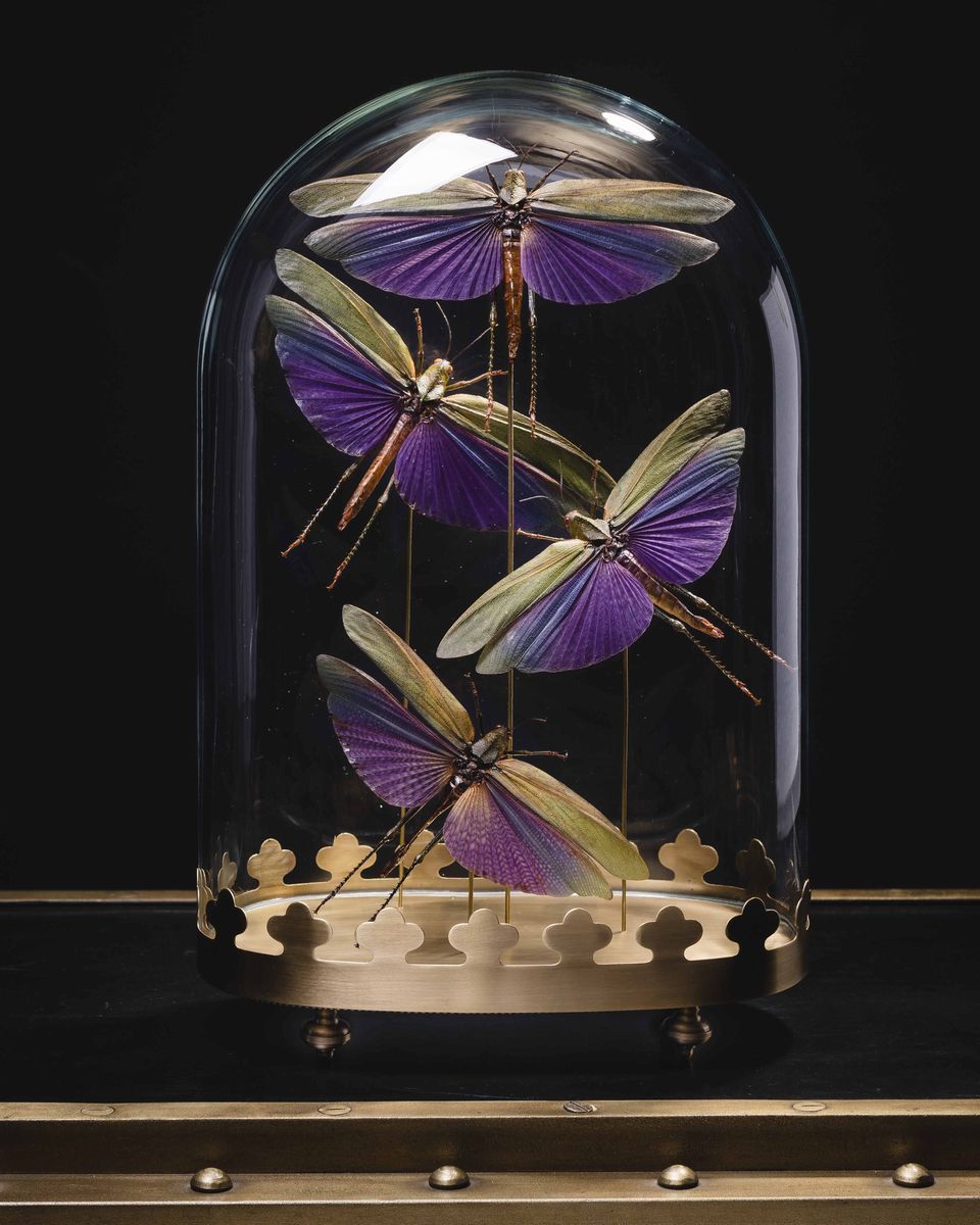 Quattro esemplari di cavalletta Titanacris albipes in una campana ovale di vetro, base in ottone. cm 44x29x16