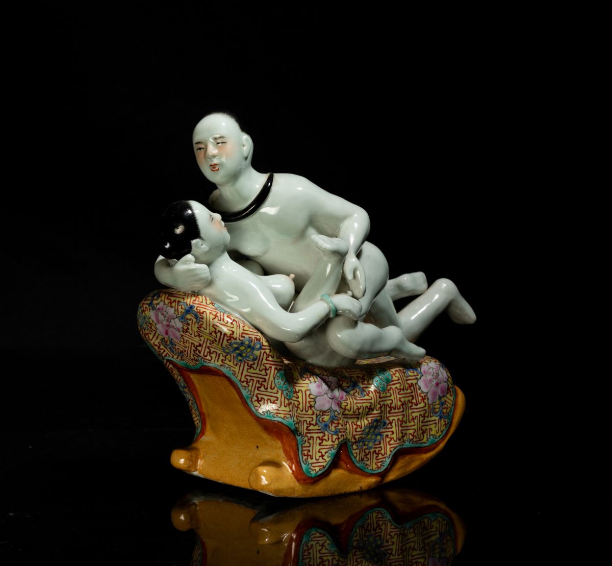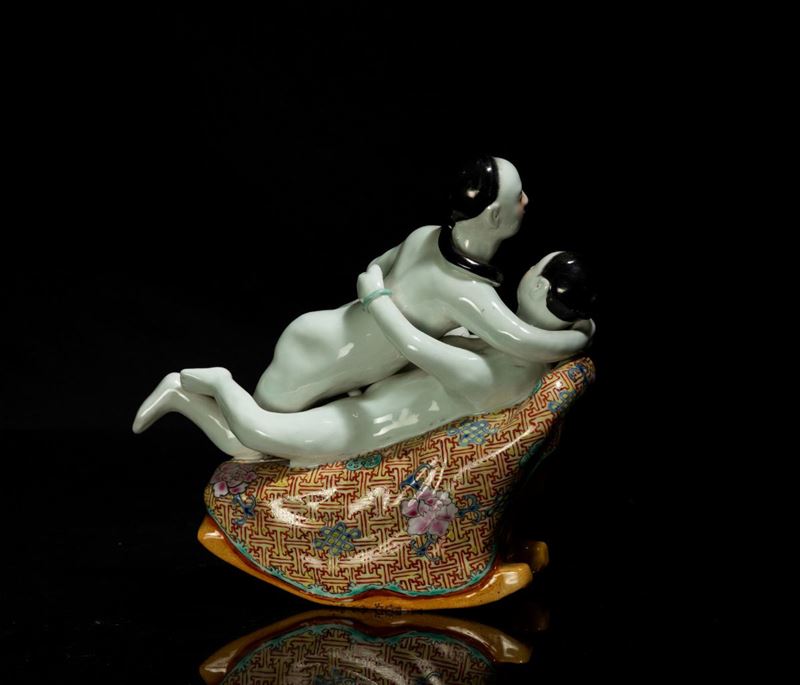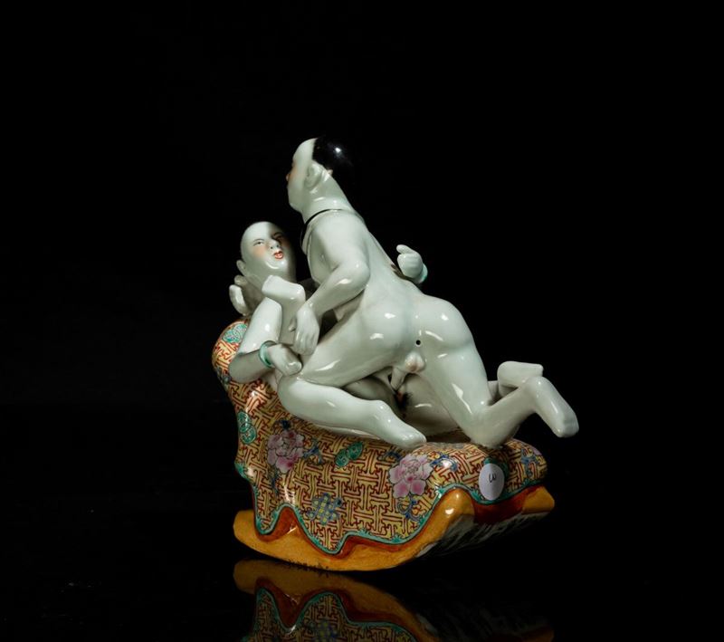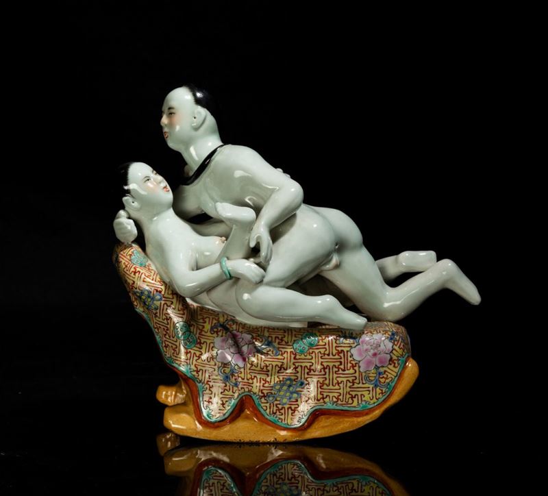 Gruppo erotico ispirato al Kamasutra. Porcellana dipinta. Cina XX secolo