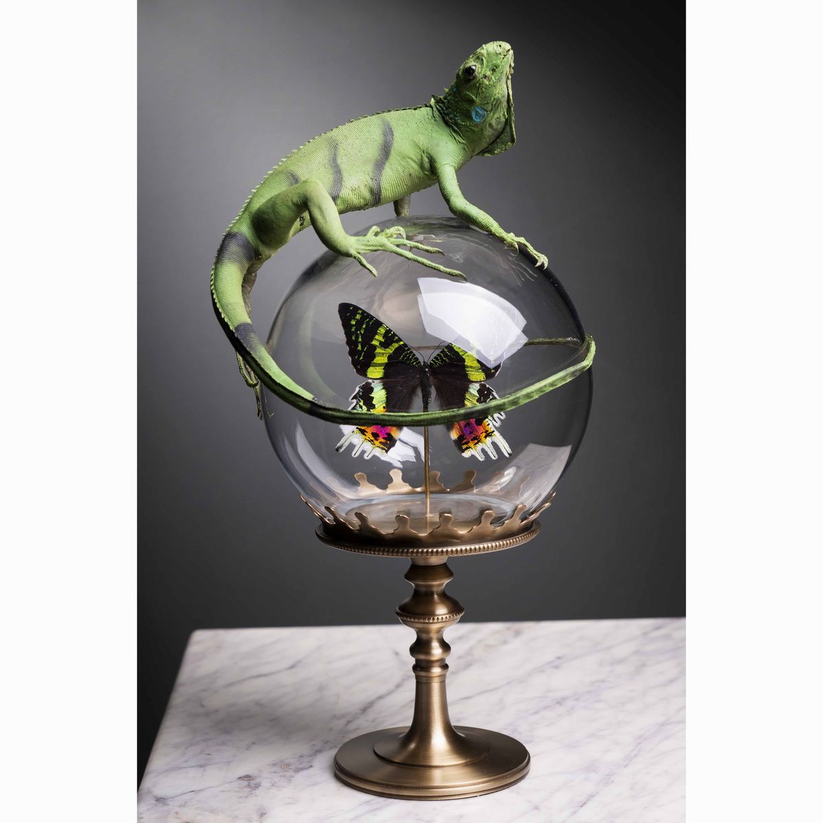Iguana verde (Iguana iguana) proveniente da un giardino zoologico olandese, su sfera in vetro contenente una farfalla (Chrysiridia rhipheus) base in ottone
