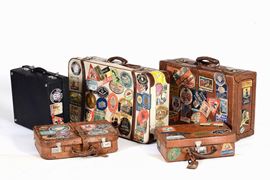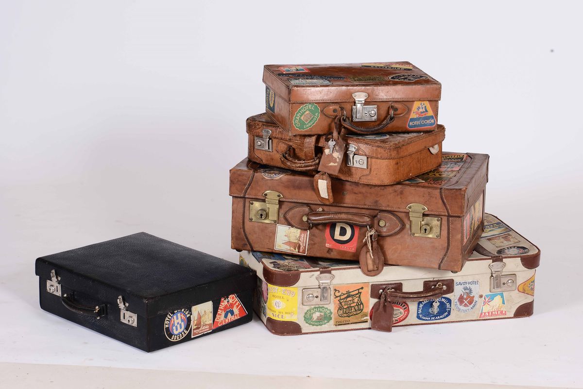 Lotto composto da cinque valigie da viaggio in cuoio con adesivi di hotel europei, XX secolo