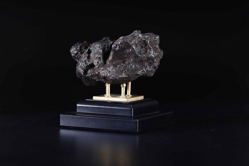 Meteorite ferrosa proveniente dal Campo del Cielo, Argentina. Base in legno e ottone; 18,4 kg, cm 32x18x15