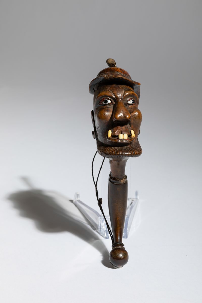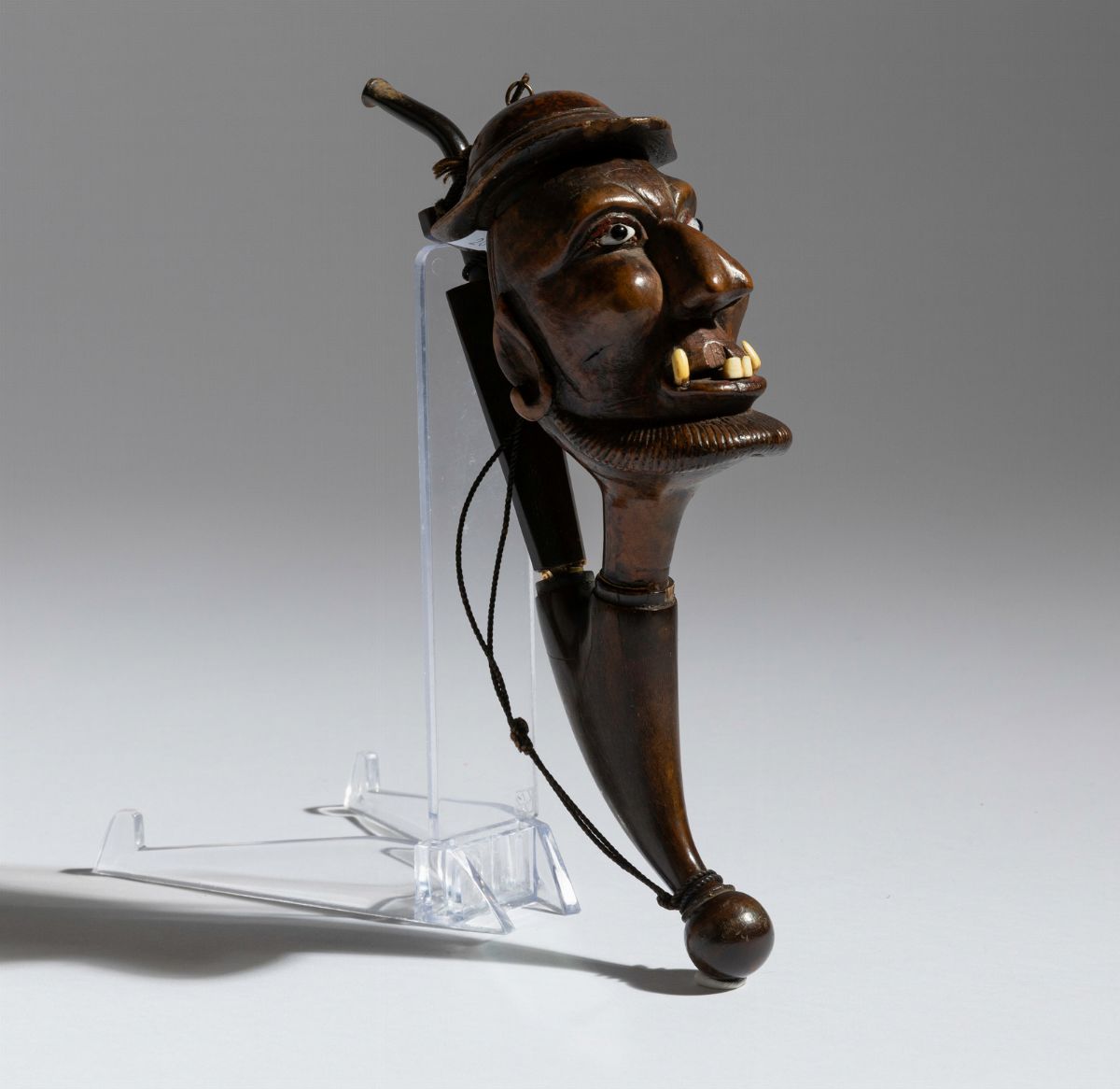 Pipa in radica raffigurante uomo con cappello con dettagli in osso, pasta di vetro e bocchino in corno, Svizzera, fine del XIX secolo