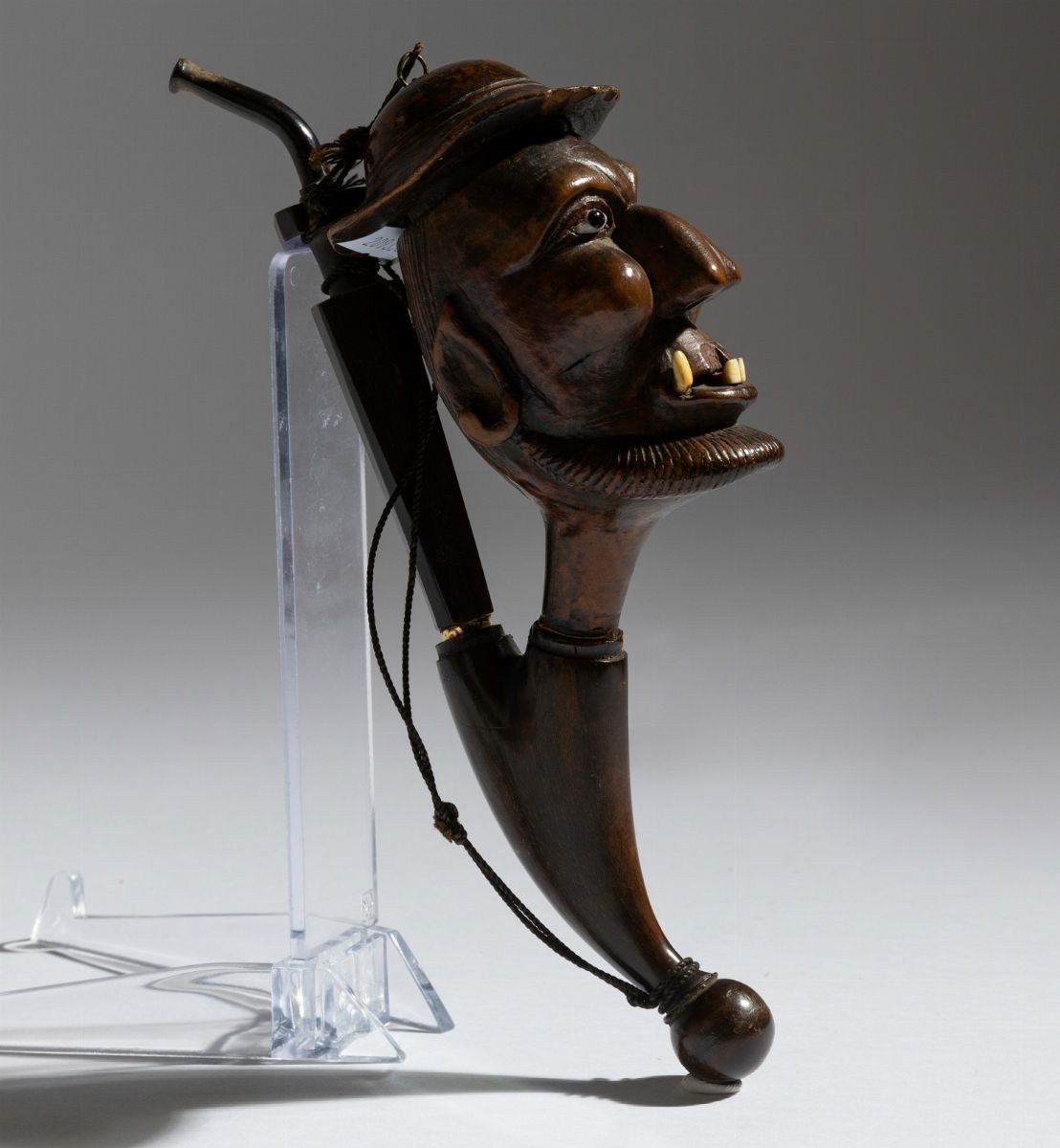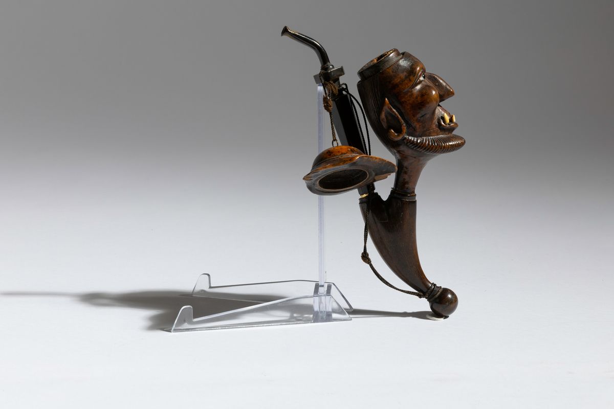 Pipa in radica raffigurante uomo con cappello con dettagli in osso, pasta di vetro e bocchino in corno, Svizzera, fine del [..]