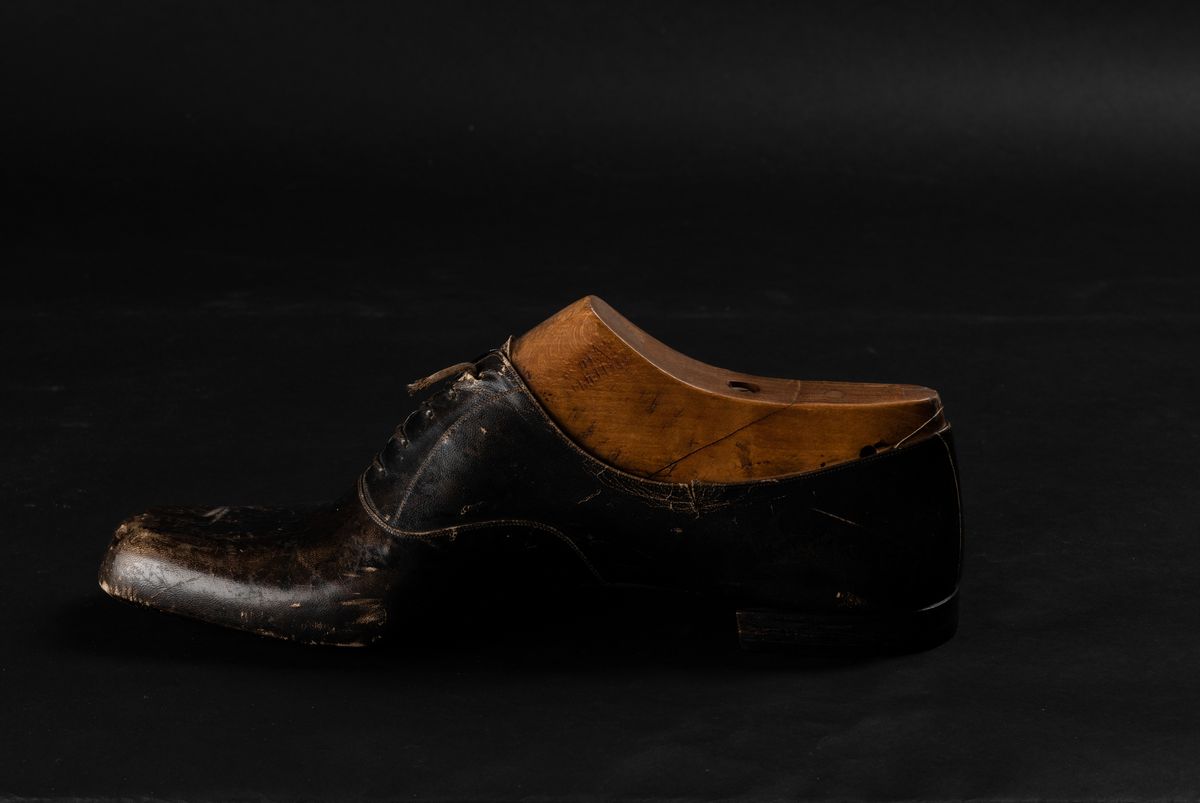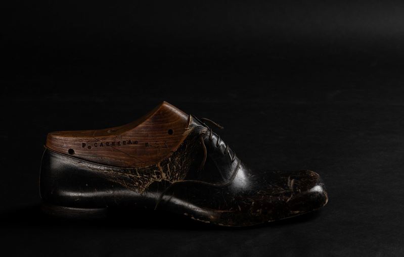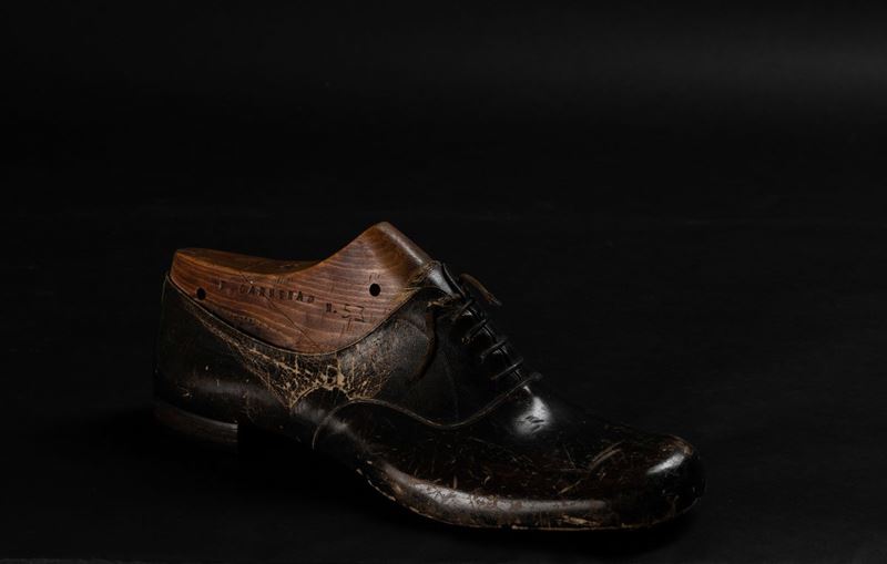 Modello di scarpa n.53 in legno con incisione del nome e scarpa in cuoio del pugile Primo Carnera, cm 34