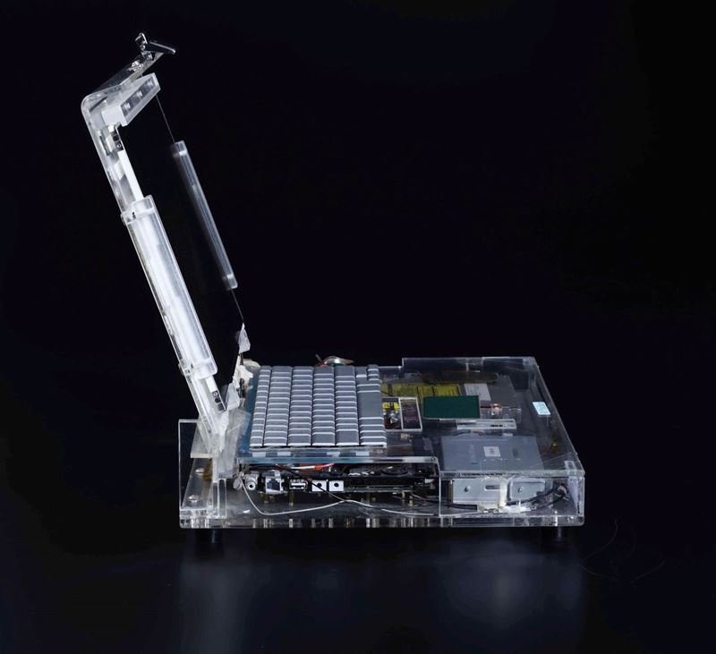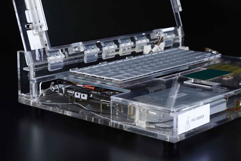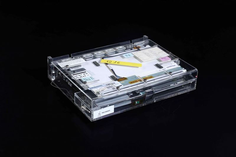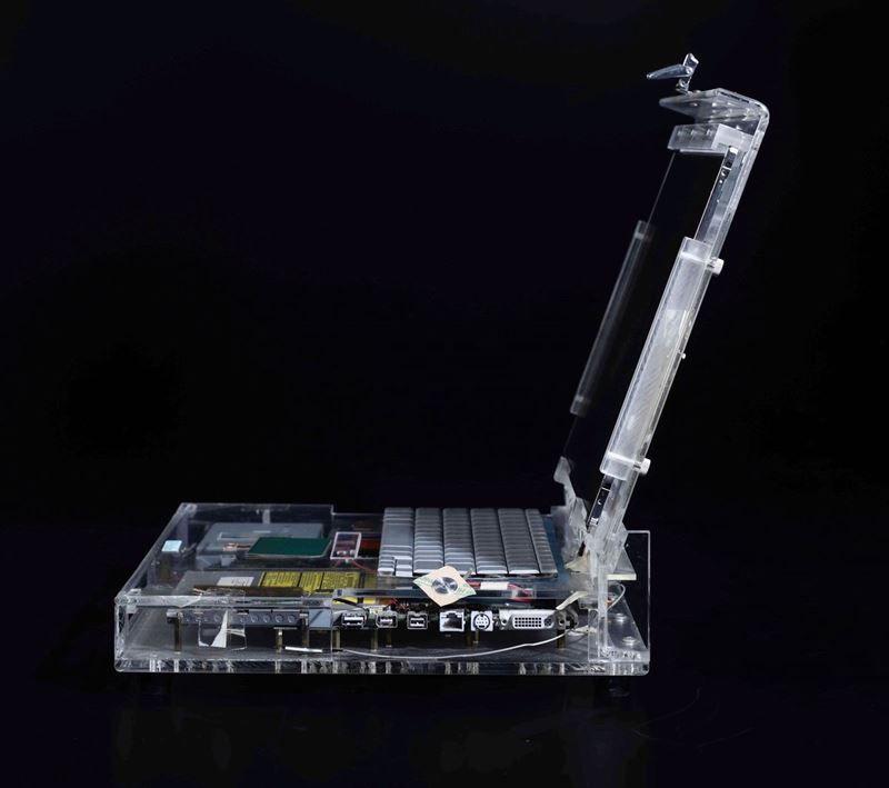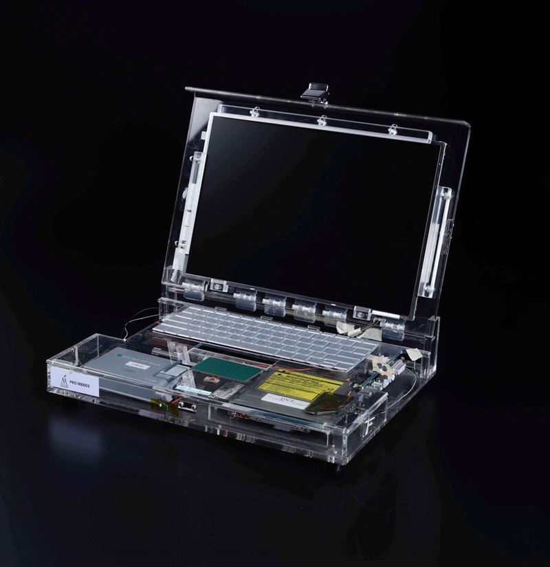 Questo lotto è un pezzo unico, rappresenta il terzo stadio dello studio di prototipo, quello successivo è la versione di design e messa in vendita. Il computer è costituito da una valigetta in acrilico trasparente, contrassegnata con numerose etichette originali Apple che ne descrivono la componentistica interna utilizzata. Spiccano in particolare 'Apple Development Team' all'esterno e 'Go Postburn' all'interno, che ne definisce il funzionamento testato. In effetti il prototipo, opportunamente alimentato, è tuttora funzionante, e se dotato di un disco rigido di avvio coevo carica il sistema operativo regolarmente, a dimostrazione che si tratta di un oggetto in fase finale di studio. Attraverso l'acrilico è possibile apprezzare la componentistica interna scelta, la batteria, il lettore cd, il pulsante di accensione, il trackpad; vi sono numerosi collegamenti 'volanti' a filo. Il prodotto commerciale che ne deriva si chiamerà Powerbook G4 alluminum (2003) e verrà venduto in varie dimensioni: 12, 15 e 17. Il prototipo è funzionante.