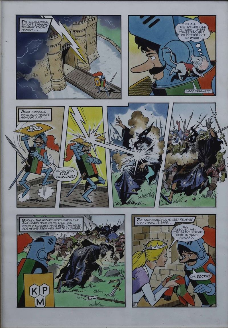2 Tavole originali con cornice. Formato cm 48x34. Londra, anni '70. Già di proprietà di Franco Cosimo Panini, cofondatore delle Edizioni Panini SpA. Sono 2 tavole originali del numero pilota della rivista incentrata sul personaggiodi Pipino il Paladino (denominato nel testo inglese Knight Panini, ambientato nel reame di Verde Modena con il topolino-scudiero di nome Pasta)