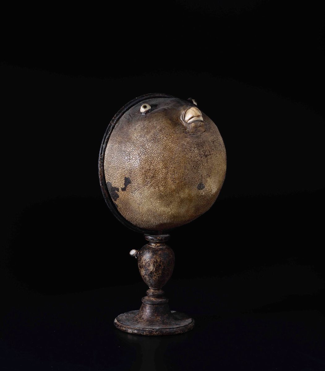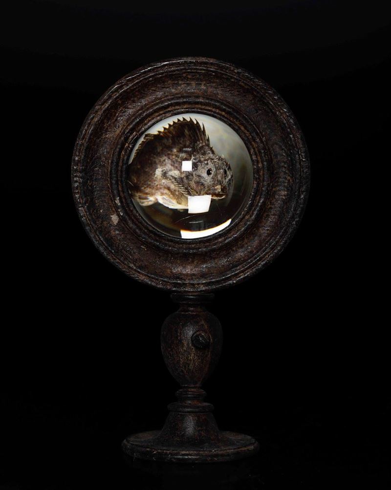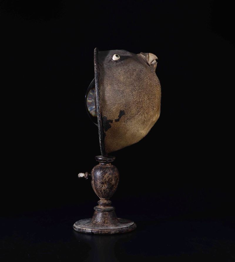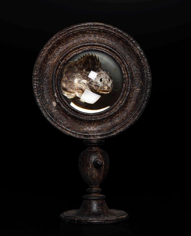 Testa di pesce palla con lente in vetro e pesciolino su base in legno