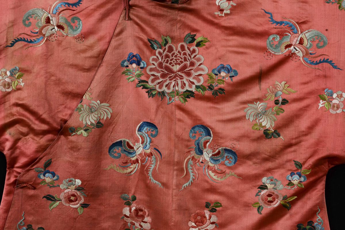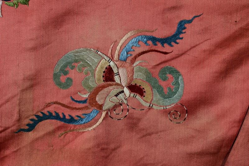 Veste imperiale in seta a fondo rosso finemente ricamata con figure di farfalle e decori floreali, Cina, Dinastia Qing, [..]