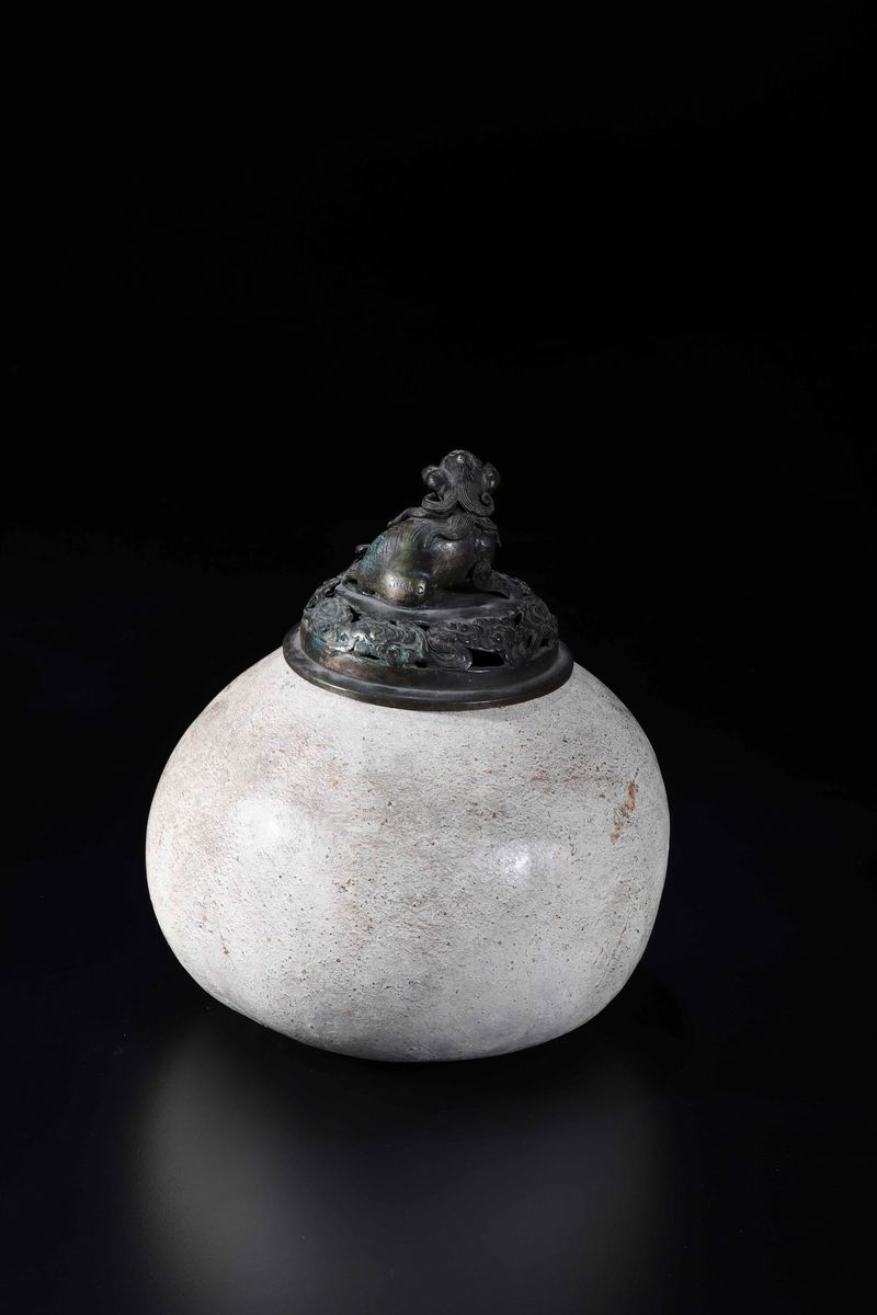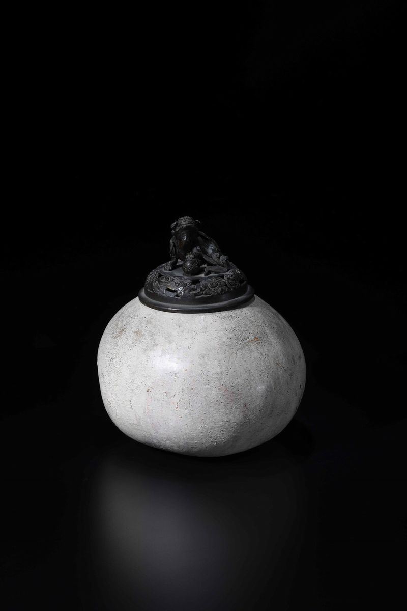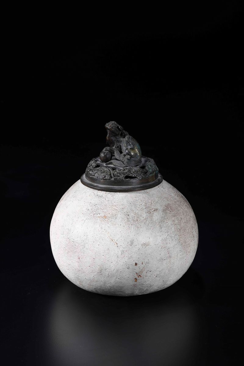 Zucca sormontata da coperchio in bronzo con cane di Pho, Cina, XIX secolo