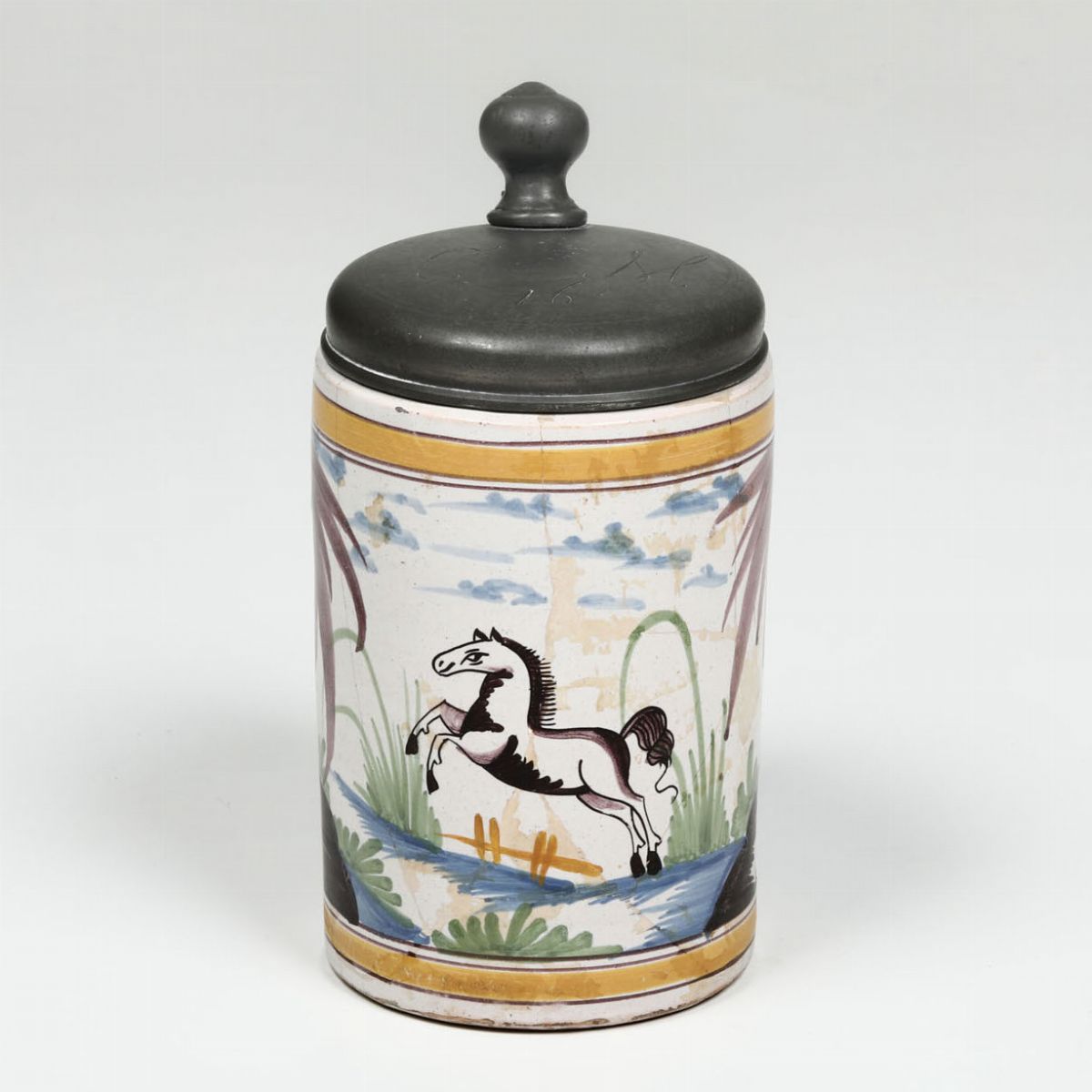 Di forma cilindrica porta un coperchio in peltro con la scritta “CM 16” ed è decorata in policromia con un cavallo in un paesaggio con vegetazione