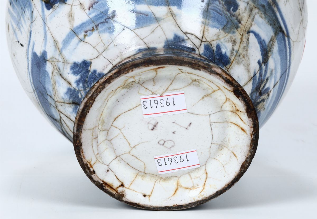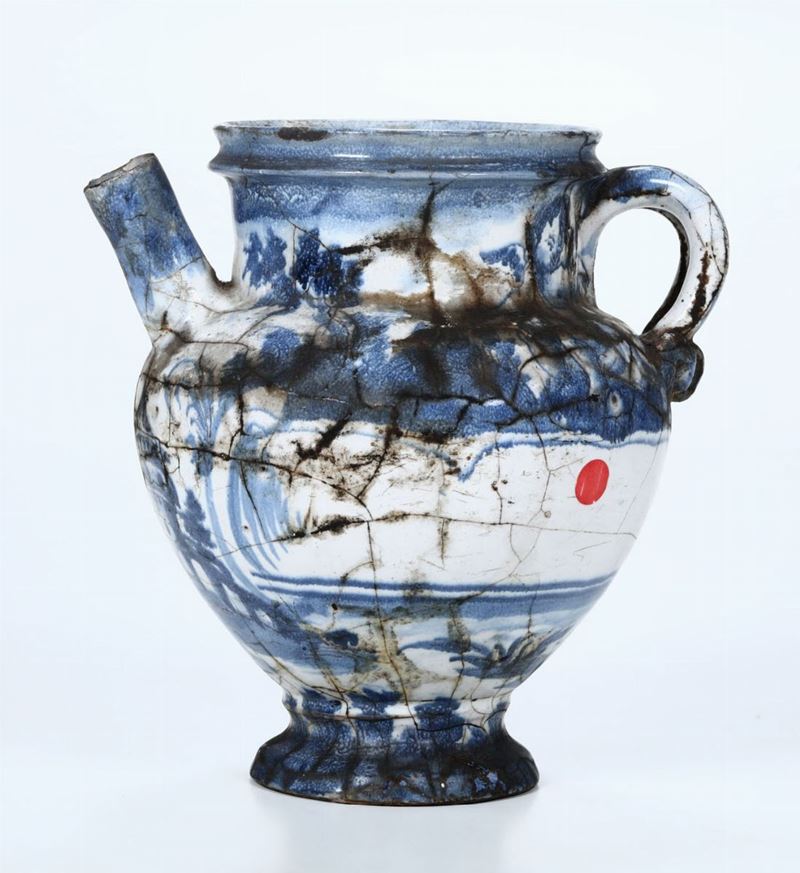 Maiolica a gran fuoco in monocromia blu di cobalto. Marca: “B.L” e globo con croce in manganese. Altezza cm 20. Estese felature