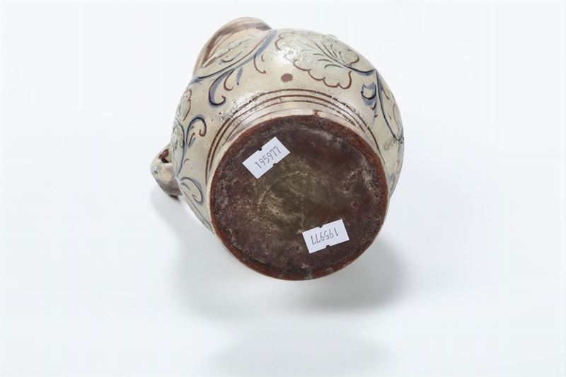 Dal corpo sferoidale con ampia bocca trilobata e manico a nastro, è decorata a rami fogliati nei toni del blu, verde e manganese
