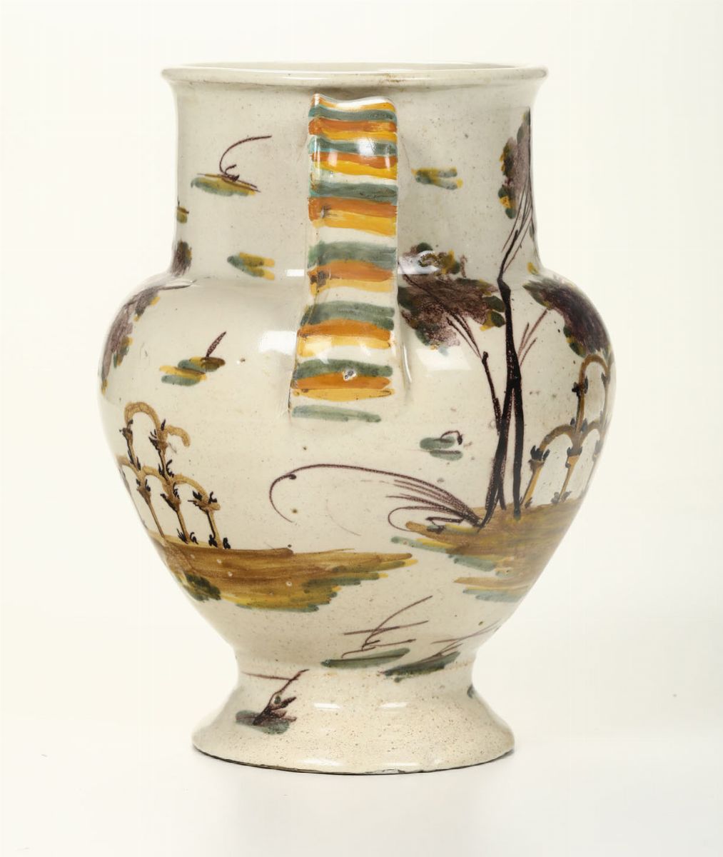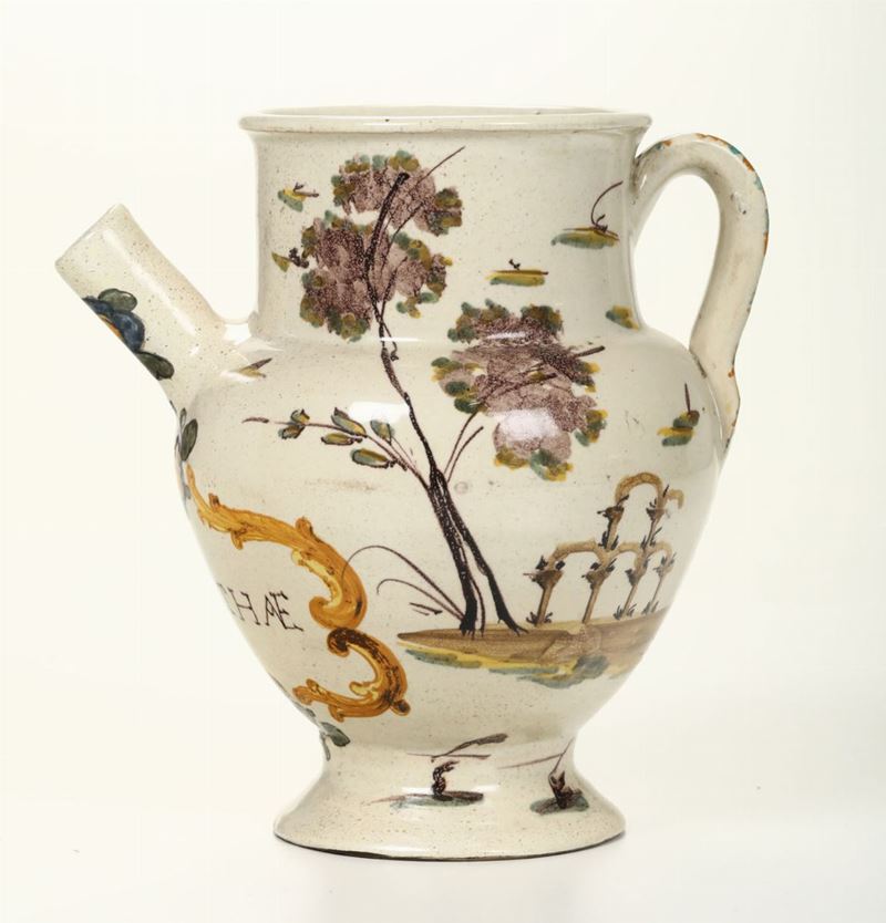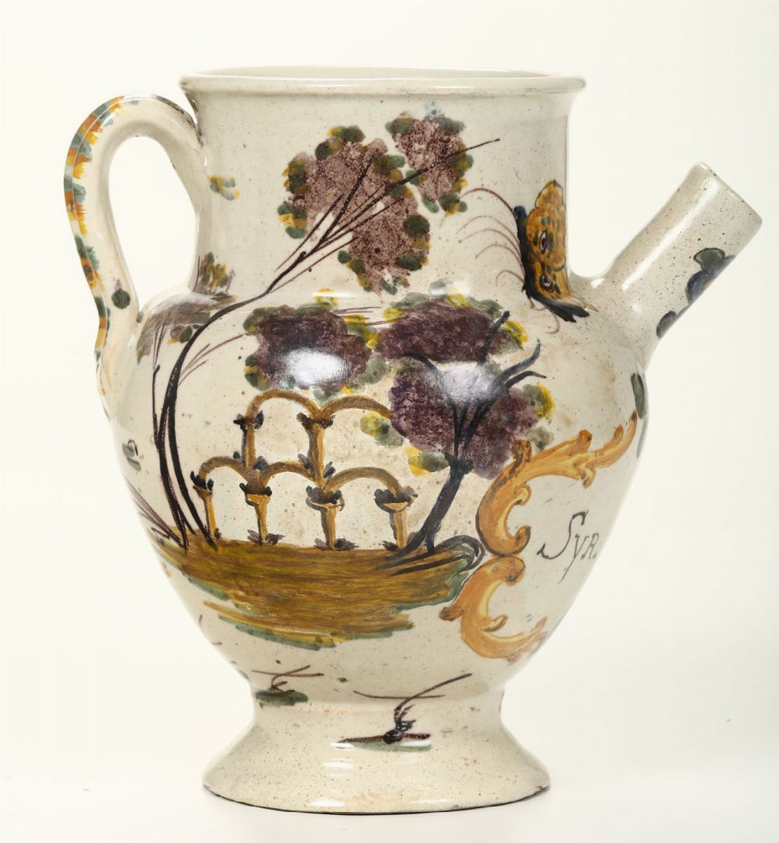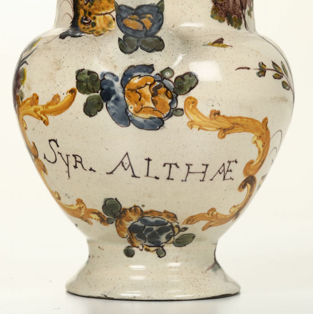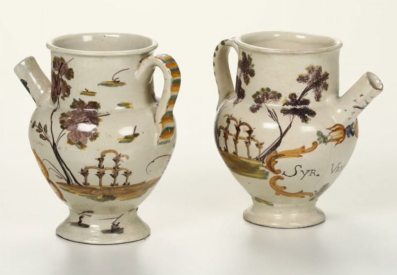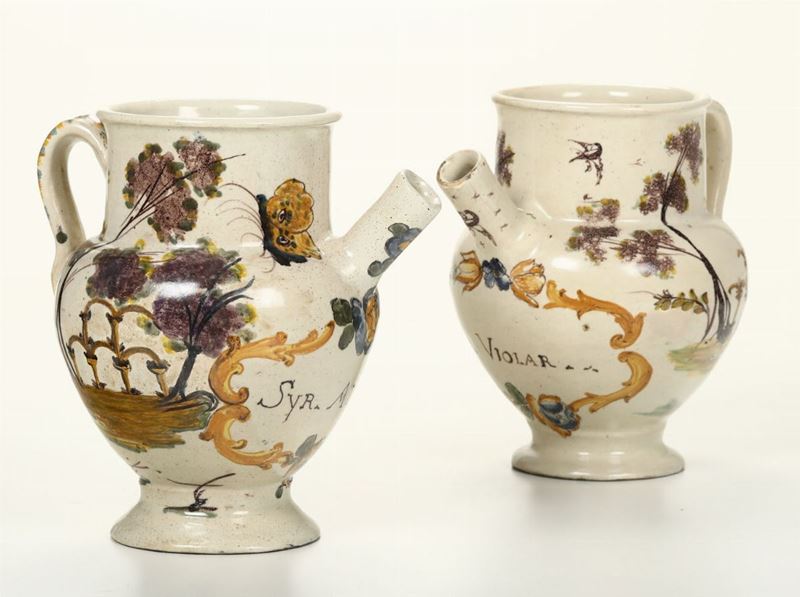 La decorazione è desunta dal genere “a figuretti e rovine”. Sui nostri boccali i ruderi sono fortemente stilizzati con pochi tratti di pennello, spariscono le figurette ma rimangono gli alberi, gli uccelli e un’enorme farfalla. Sotto il beccuccio troviamo un cartiglio a rocailles, con fiori fogliati, che ospita la scritta apotecaria “Syr. Althae” e rispettivamente “Syr. Violar”