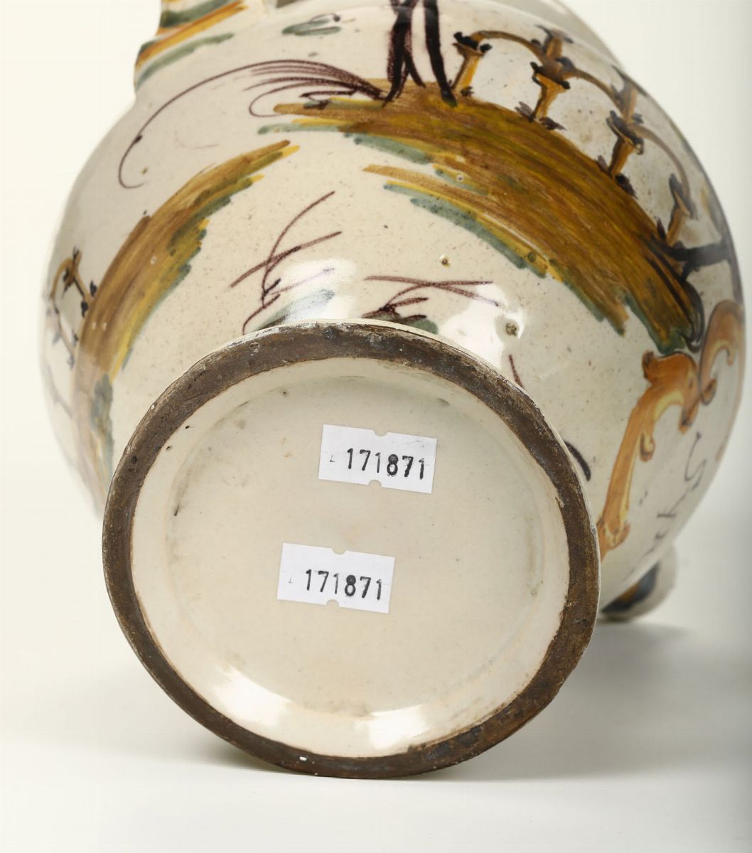Maiolica policroma a gran fuoco. Marca: assente. Altezza cm 20. Restauri e ampie cadute di smalto riprese in restauro