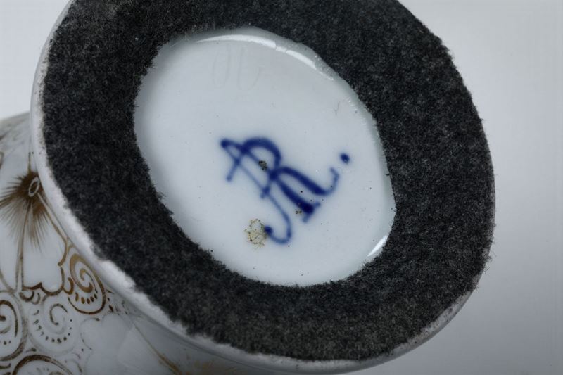 Porcellana. Marca: “AR” in blu ad imitazione del marchio di Meissen. Altezza cm 25. Una presa riattaccata; usure all’oro