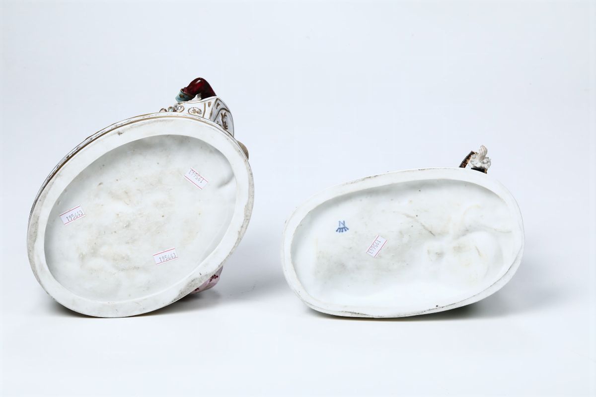 Porcellana policroma. Marca: sotto ad un pezzo “N” con corona in blu. Altezza cm 24,5x22x17; altezza cm 20,5x22x11,5. Manico chitarra e pizzi con rotture; l’altro gruppo con una testa rincollata e rotture ai fiorellini.