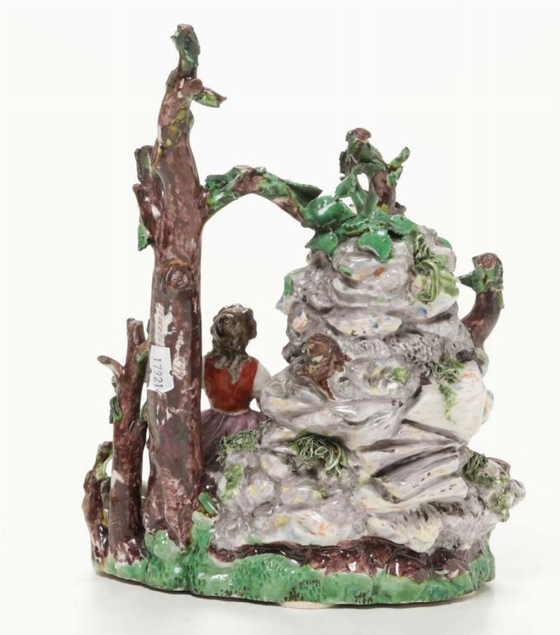 Porcellana policroma. Marca: assente; lettera “H” impressa. Altezza cm 24. Braccio sinistro del personaggio femminile ed albero restaurati; minimi restauri secondari