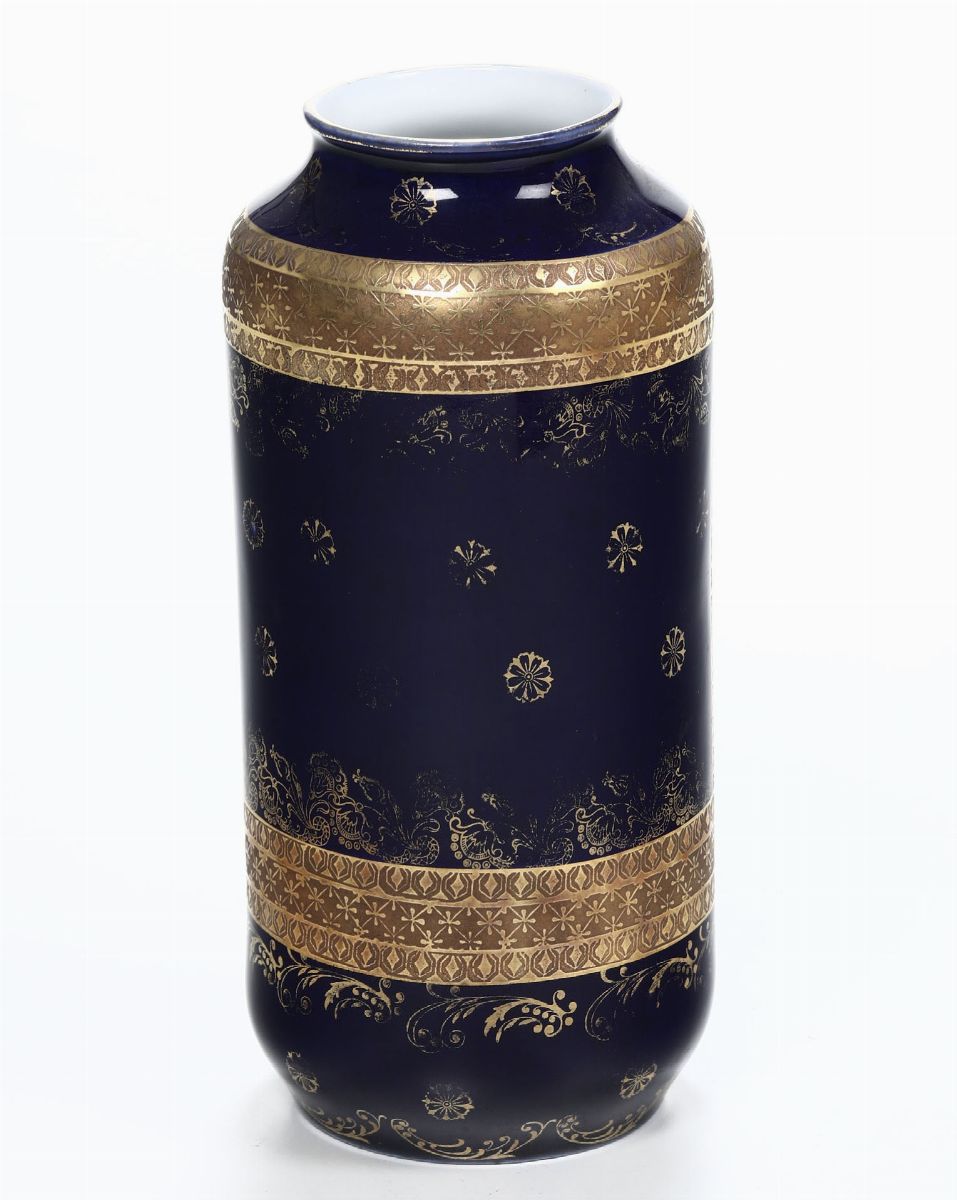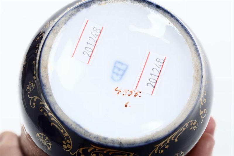 Il vaso dal fondo blu è delimitato sia superiormente che inferiormente da due fasce in oro che si uniscono frontalmente formando una riserva quadrilobata che ospita un medaglione policromo con una scena mitologica ispirata probabilmente alla pittura di Angelica Kauffman. Inoltre fiori stilizzati e rocailles in oro