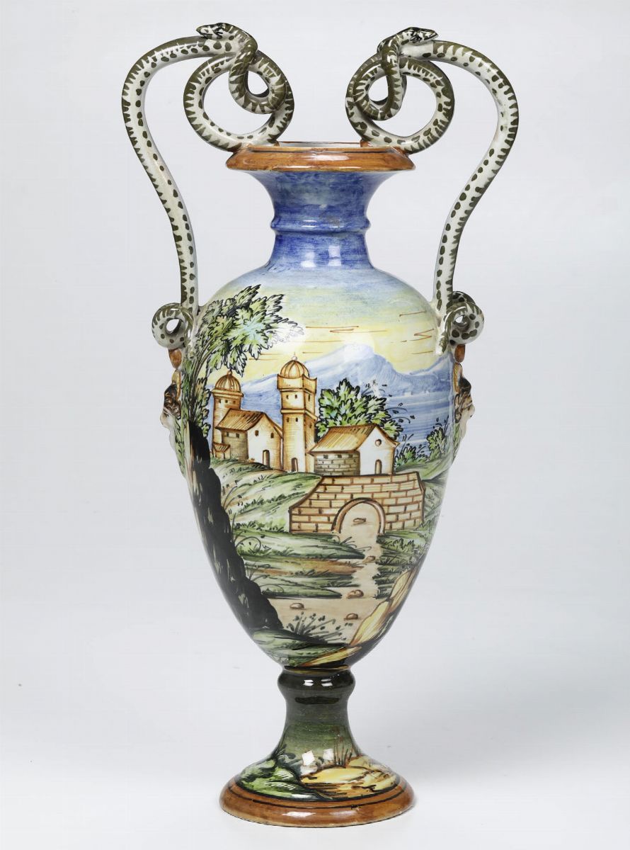 Dalla forma a balaustro ospita ai lati due mascheroni barbuti con corna da cui partono le anse modellate a serpenti. Sia l’aspetto plastico che la decorazione pittorica policroma “a istoriato” sono ispirati dalle maioliche rinascimentali