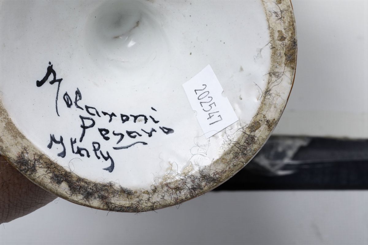 Maiolica. Marca: “Molaroni Pesaro Italy” in nero. Altezza cm 40,5. Ottimo stato di conservazione, minime insignificanti cadute di smalto