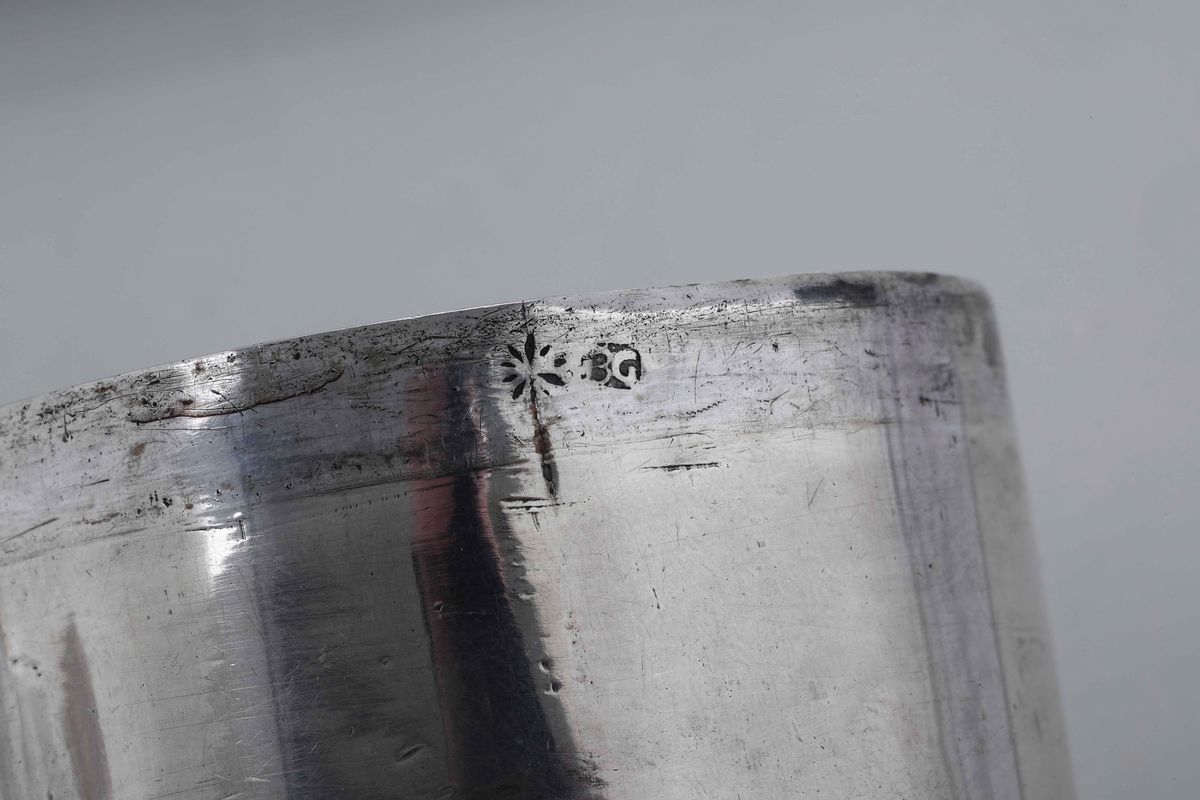 Calamaio in argento fuso, sbalzato e cesellato. Vassoio marchio Modena, XIX secolo Argentieri Giacomo e Luigi Vincenzi Contenitori Argentieri BG con raggiera (non identificato)