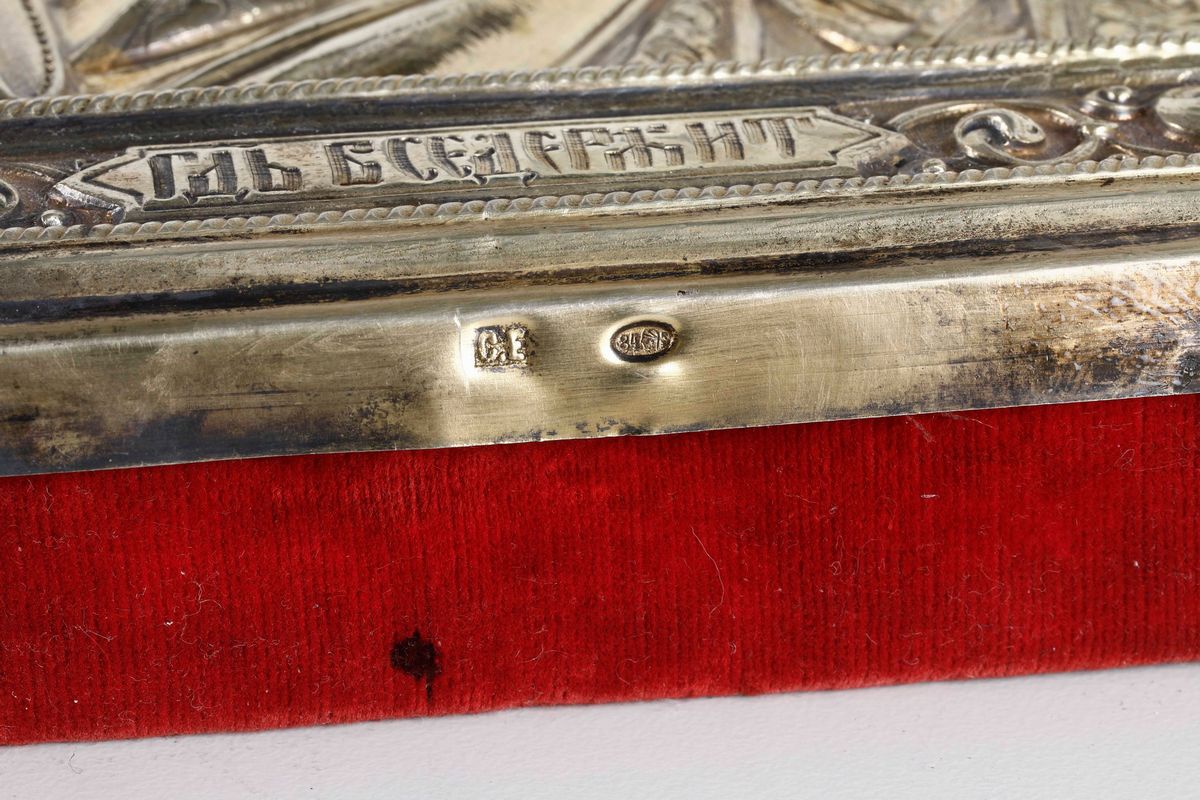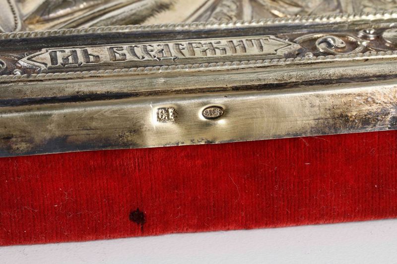 Icona con riza in argento sbalzato, cesellato e dorato raffigurante Cristo Pantocrator. Mosca (?) Marchio di titolo in uso [..]