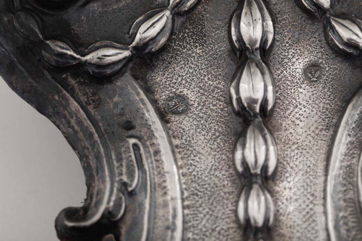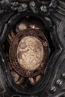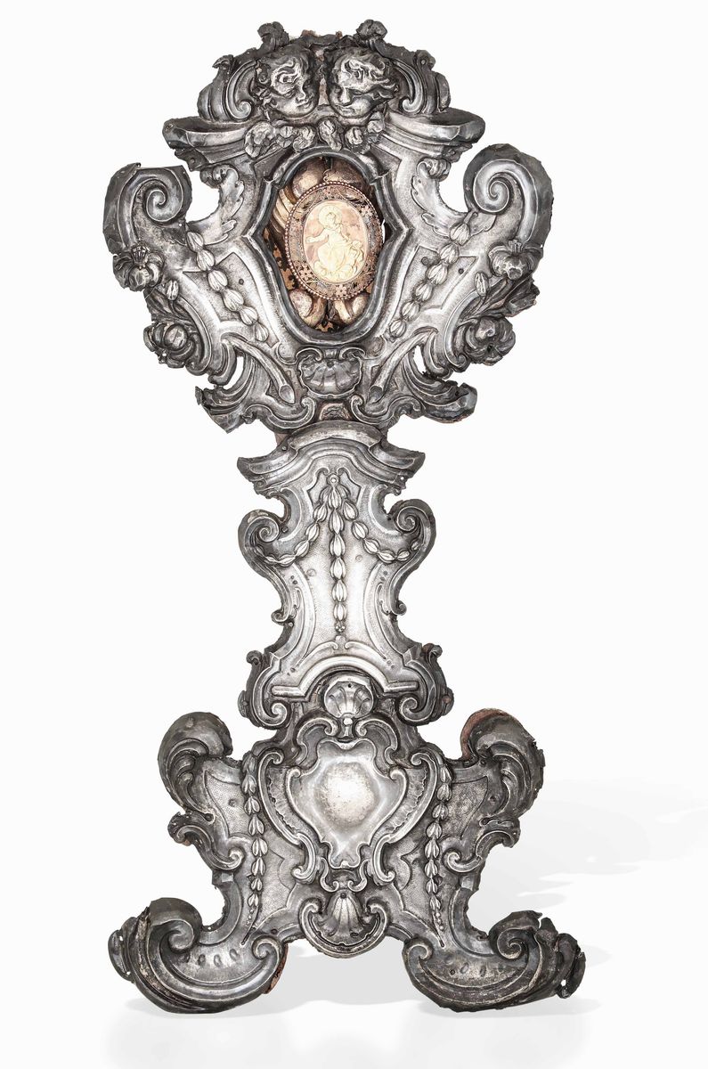 Reliquiario in lamina d'argento sbalzata, cesellata e legno sagomato. Stato Pontificio XIX secolo