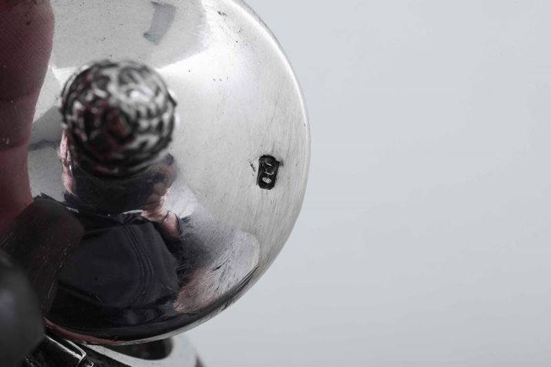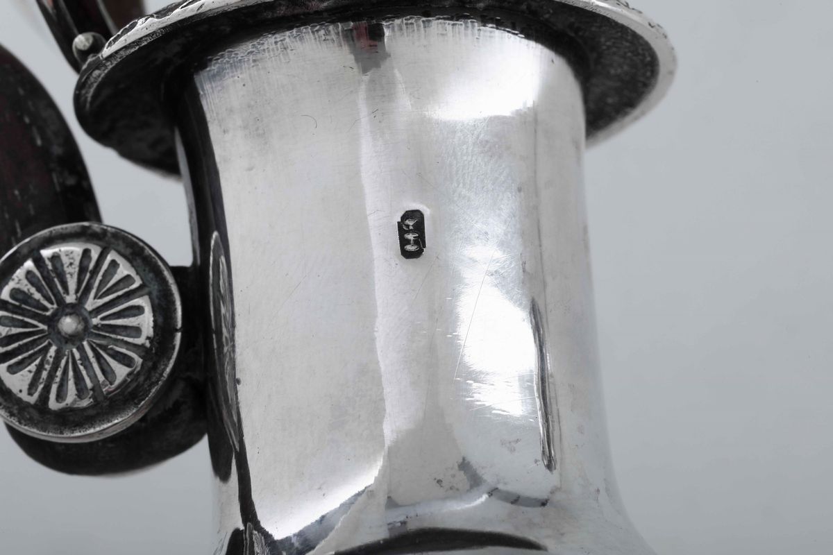 Caffettiera in argento fuso e cesellato. Manico in legno sagomato. Argenteria artistica del XX secolo. Nei modi dell'argenteria [..]