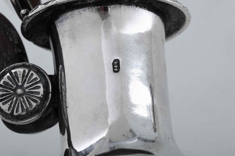 Caffettiera in argento fuso e cesellato. Manico in legno sagomato. Argenteria artistica del XX secolo. Nei modi dell'argenteria neoclassica del XIX secolo