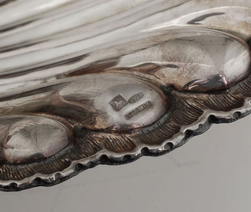 Centrotavola a forma di conchiglia con figure di ninfa marina e fauno in argento sterling. Manifattura inglese, seconda metà del XX secolo