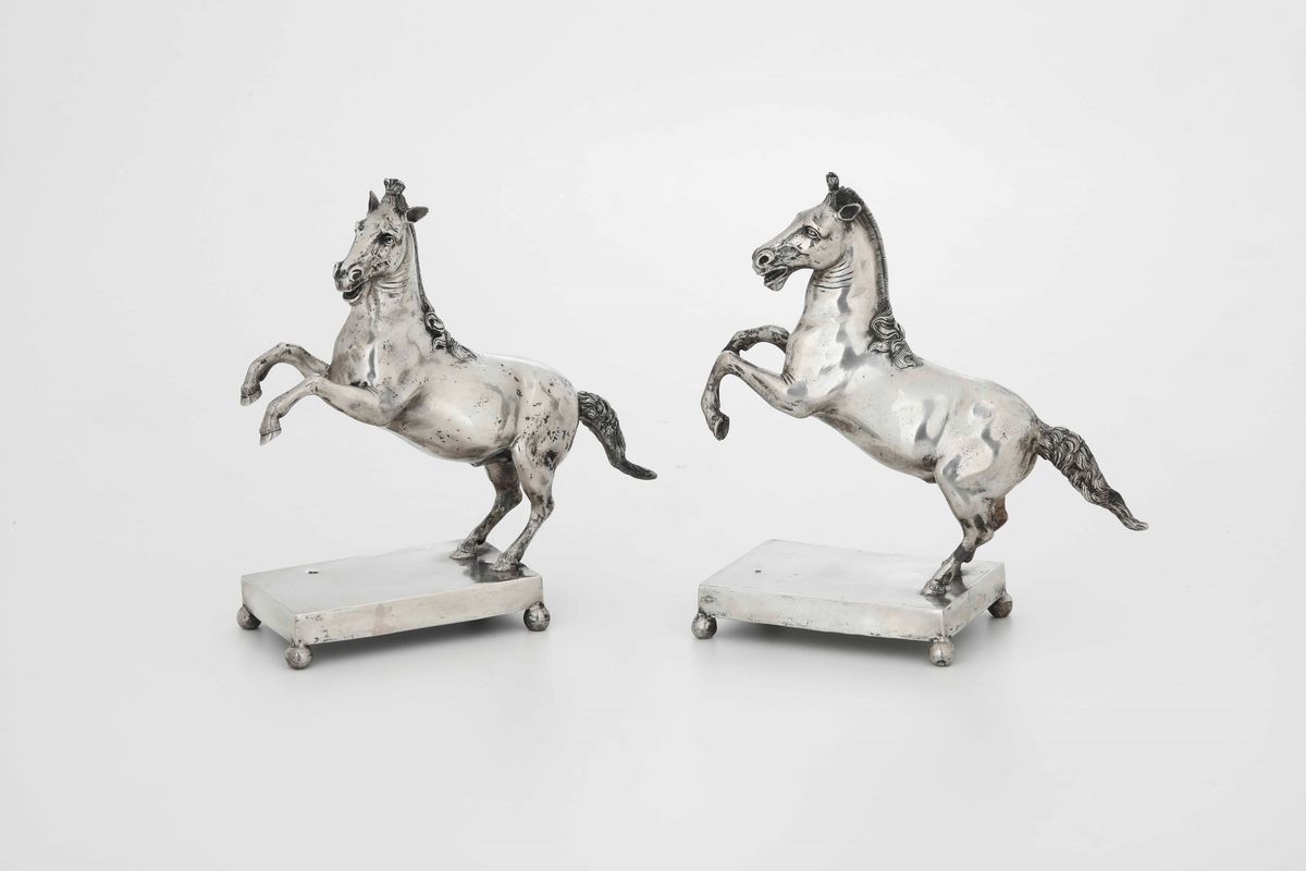 Coppia di cavalli in argento fuso e cesellato. Argenteria artistica italiana del XX secolo. Marchi ad imitazione dell’argenteria [..]