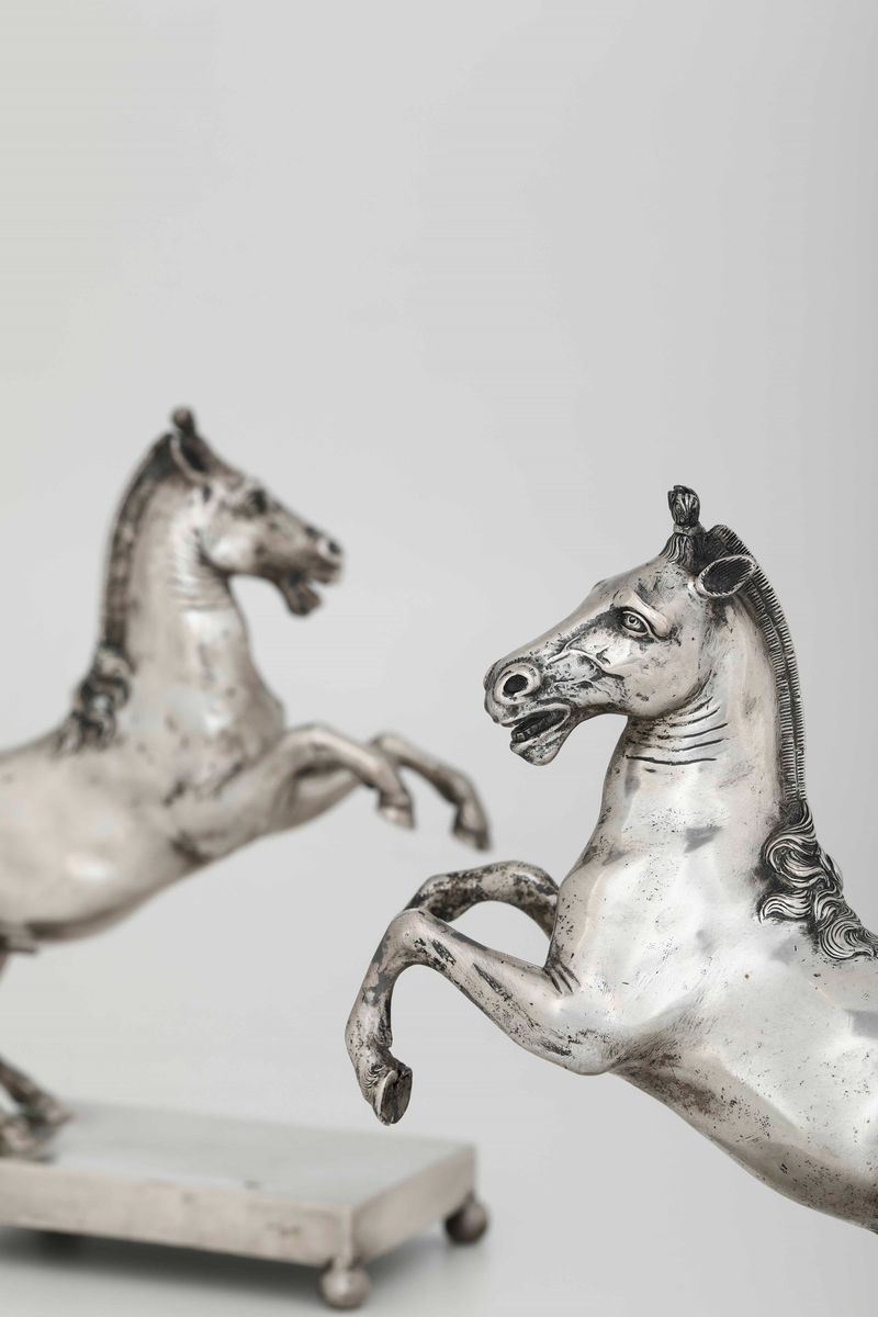 Coppia di cavalli in argento fuso e cesellato. Argenteria artistica italiana del XX secolo. Marchi ad imitazione dell’argenteria romana del XIX secolo