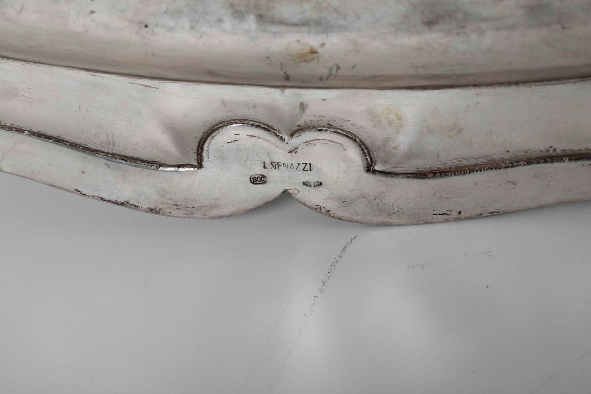 Due vassoi in argento fuso e cesellato. Bollo con fascio littorio in uso dal 1935 al 1945, argentiere Luigi Genazzi, Mila [..]