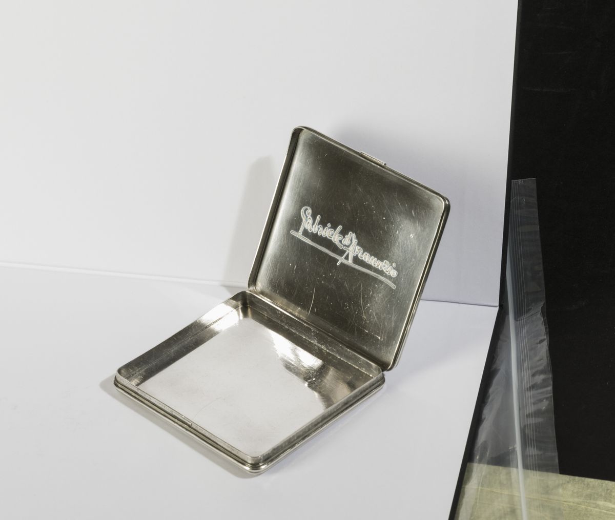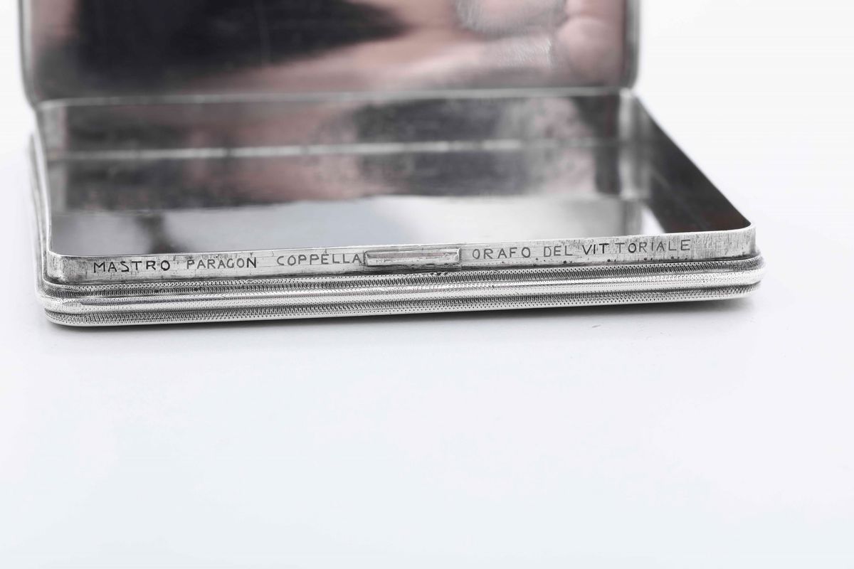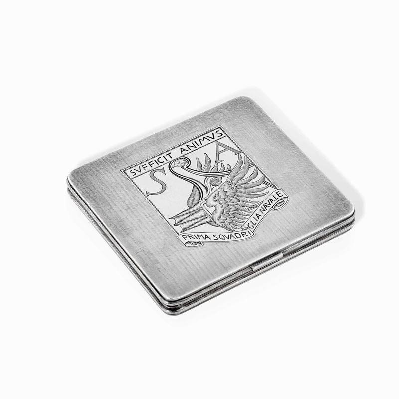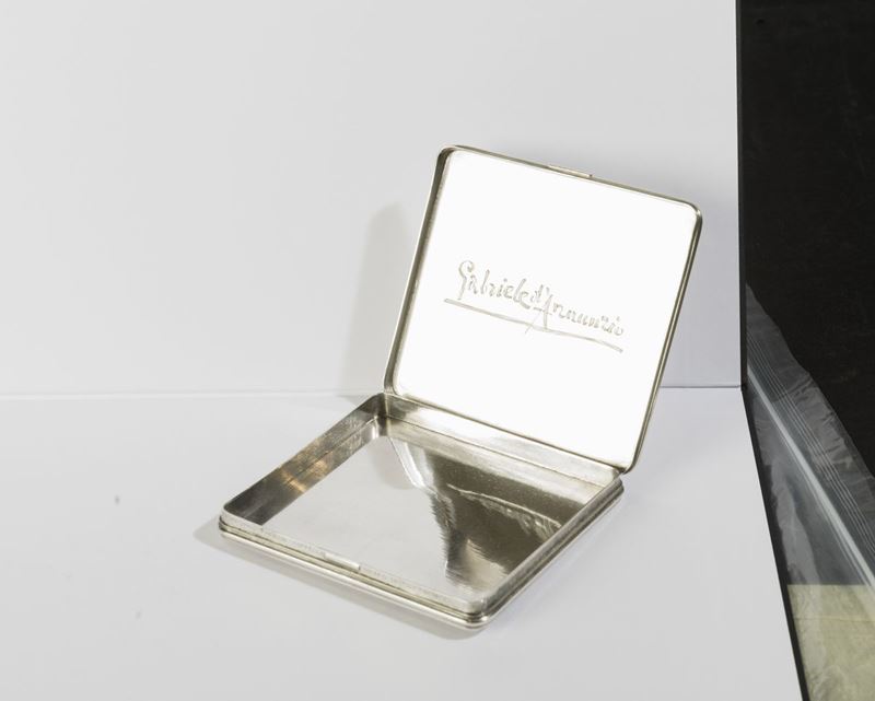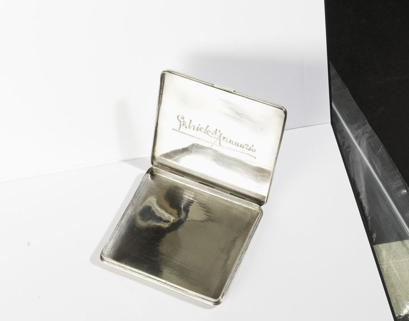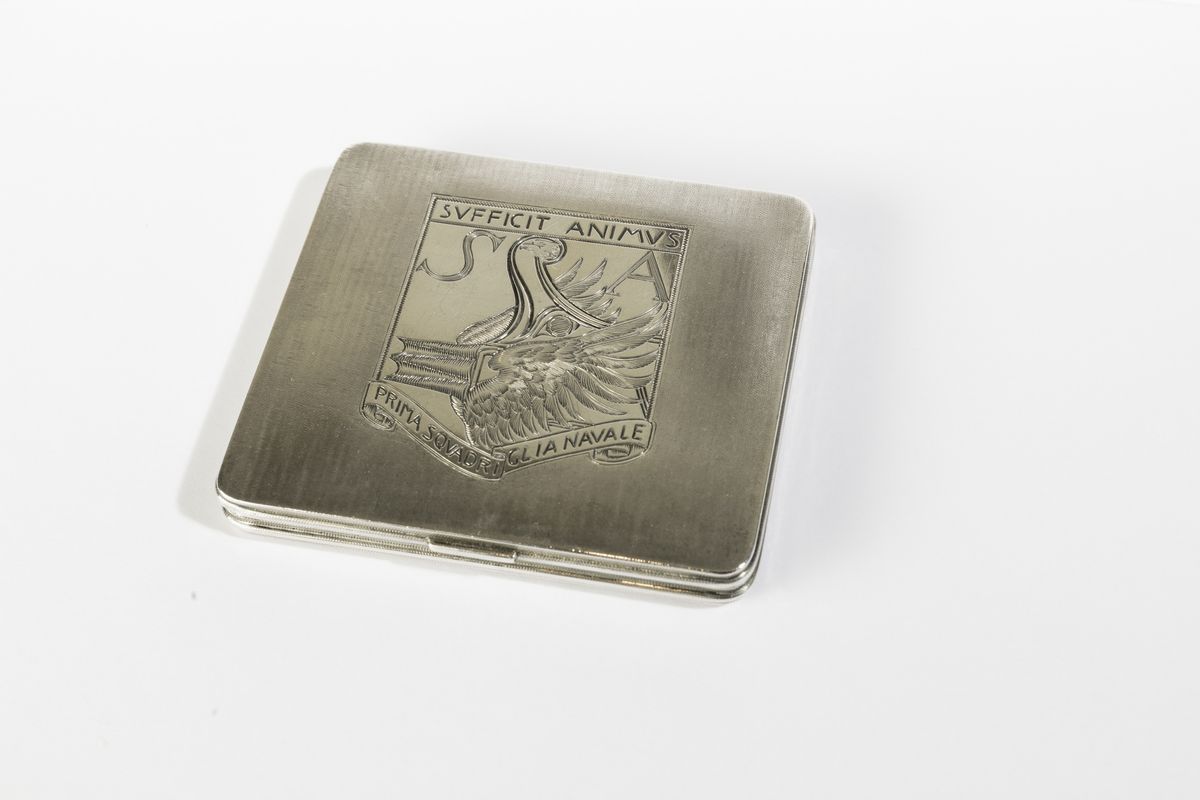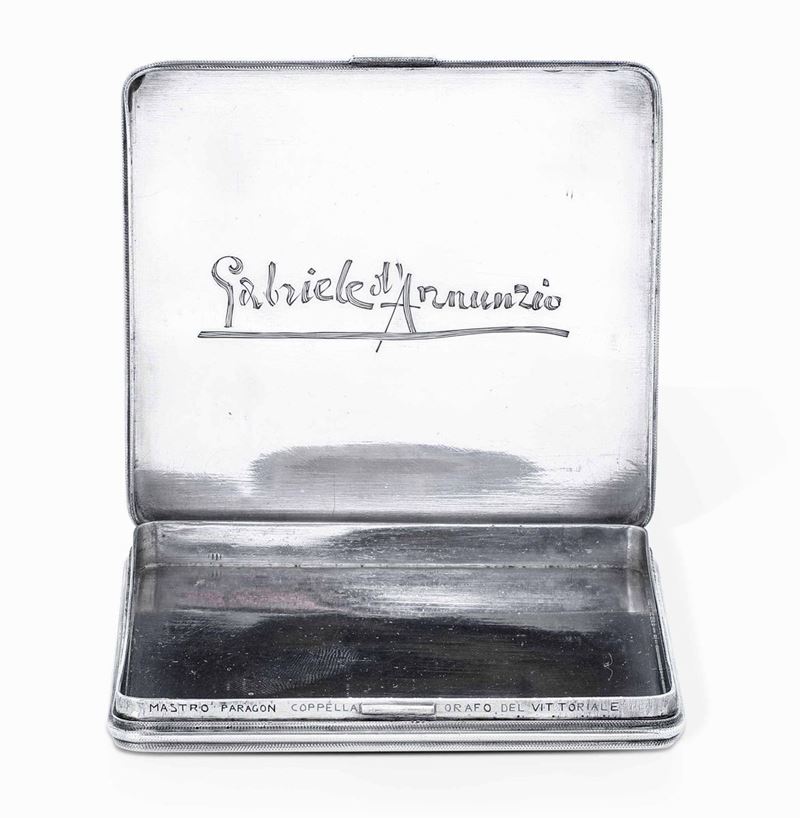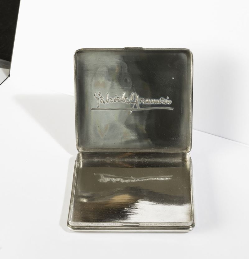 Il vate strinse amicizia con il maestro nei primi anni del novecento nominandolo “orafo del Vittoriale” e appellandolo anche “Mastro Paragon Coppella, principe degli orafi” o “ grande artista e fratello”. Molti furono i preziosi manufatti creati per lui da Buccellati che D’Annunzio spesso donava con munificenza a personaggi illustri, amici, amanti e compagni d’arme. A quest’ultima specie appartiene la nostra opera che reca sul coperchio il secondo emblema della prima squadriglia navale S.A. (Siluranti Aeree), disegnato da Adolfo de Carolis, raffigurante il rostro di una nave sorretto dalle ali di un’aquila sormontata dal motto in latino “Sufficit animus” (basta il coraggio) coniato dal vate che guidò come comandante la squadriglia dopo la sua formazione nel 1918.