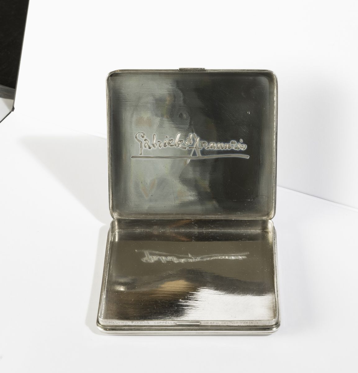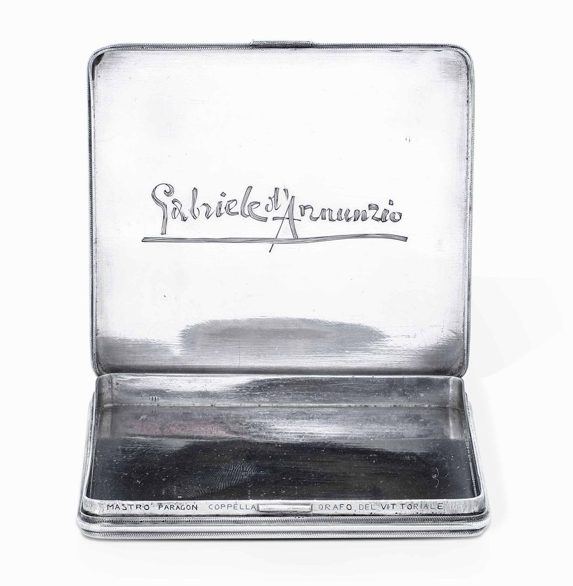 Sulla fascia frontale interna incisa la scritta: “Mastro Paragon Coppella orafo del Vittoriale” e sotto il coperchio incisa firma Gabriele D’Annunzio.