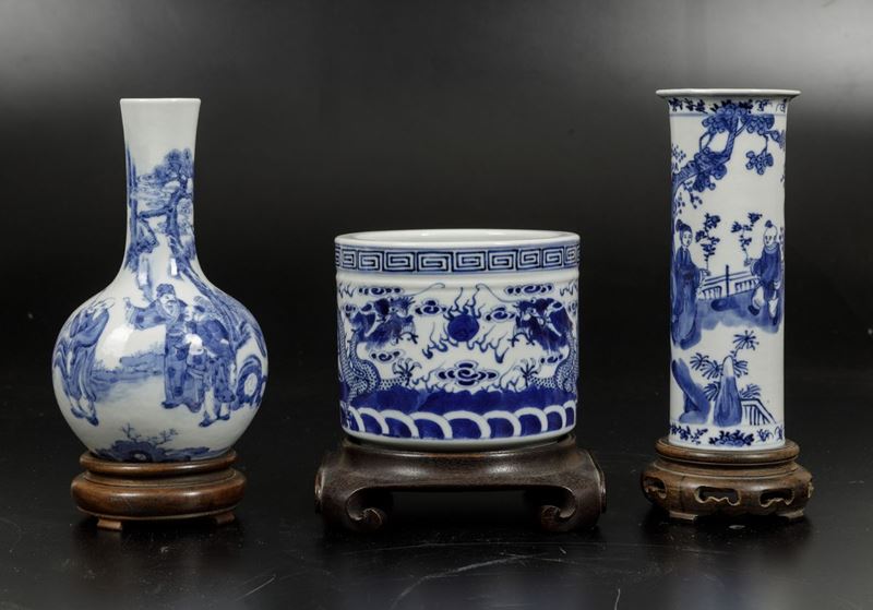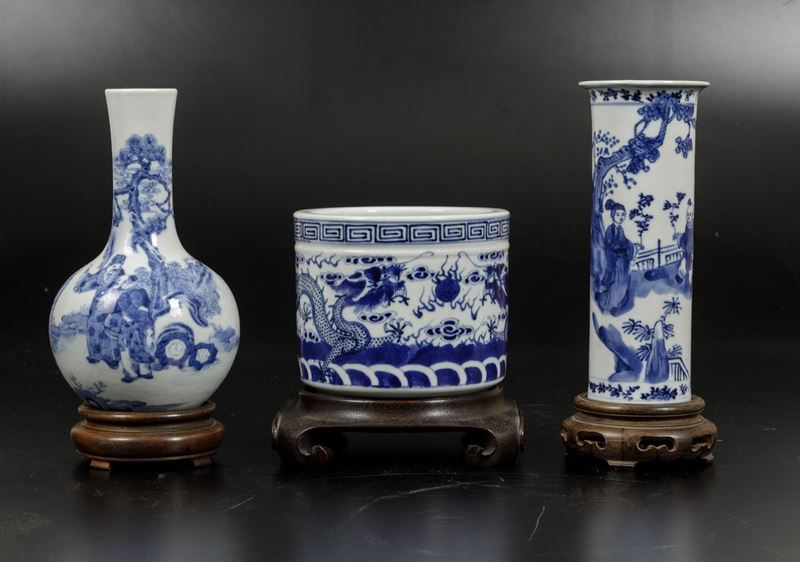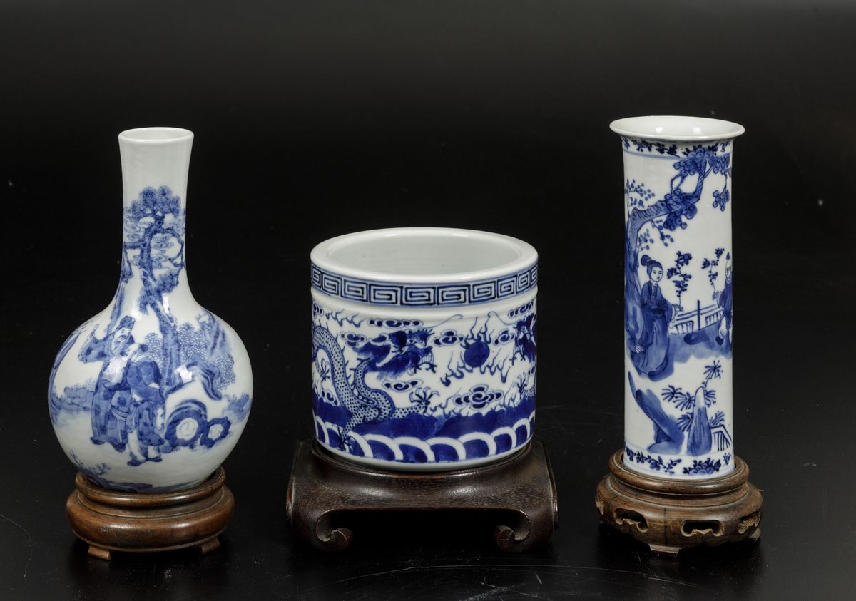 A lot with a small bottle, a cylinder shaped vase and a paintbrush rinser in white and blue porcelain, Qing Dynasty, 1800s. H 22cm and 25cm; 14x14cm