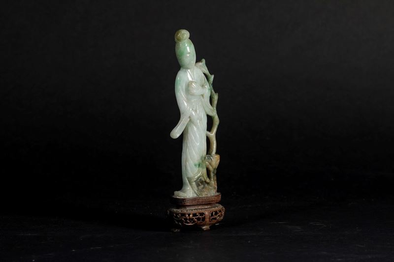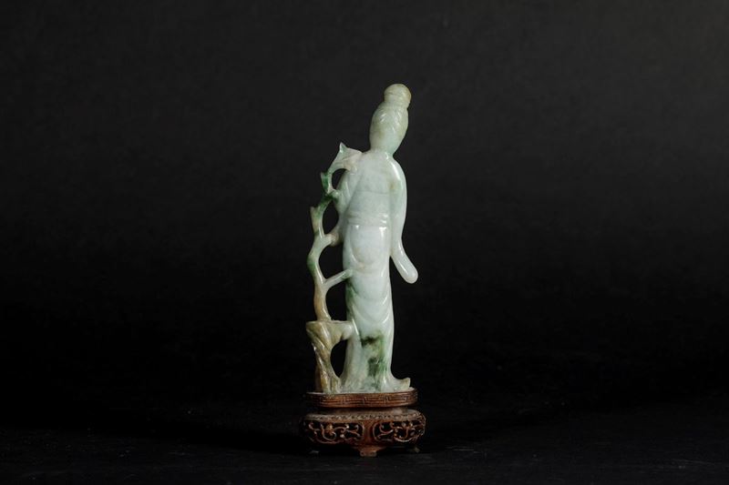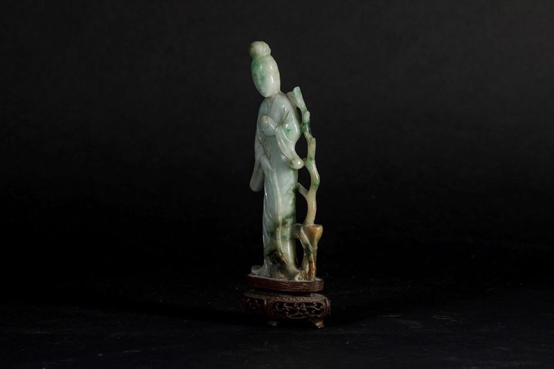 A figure of a woman with a flower branch carved in jadeite with a wooden base. H 13cm